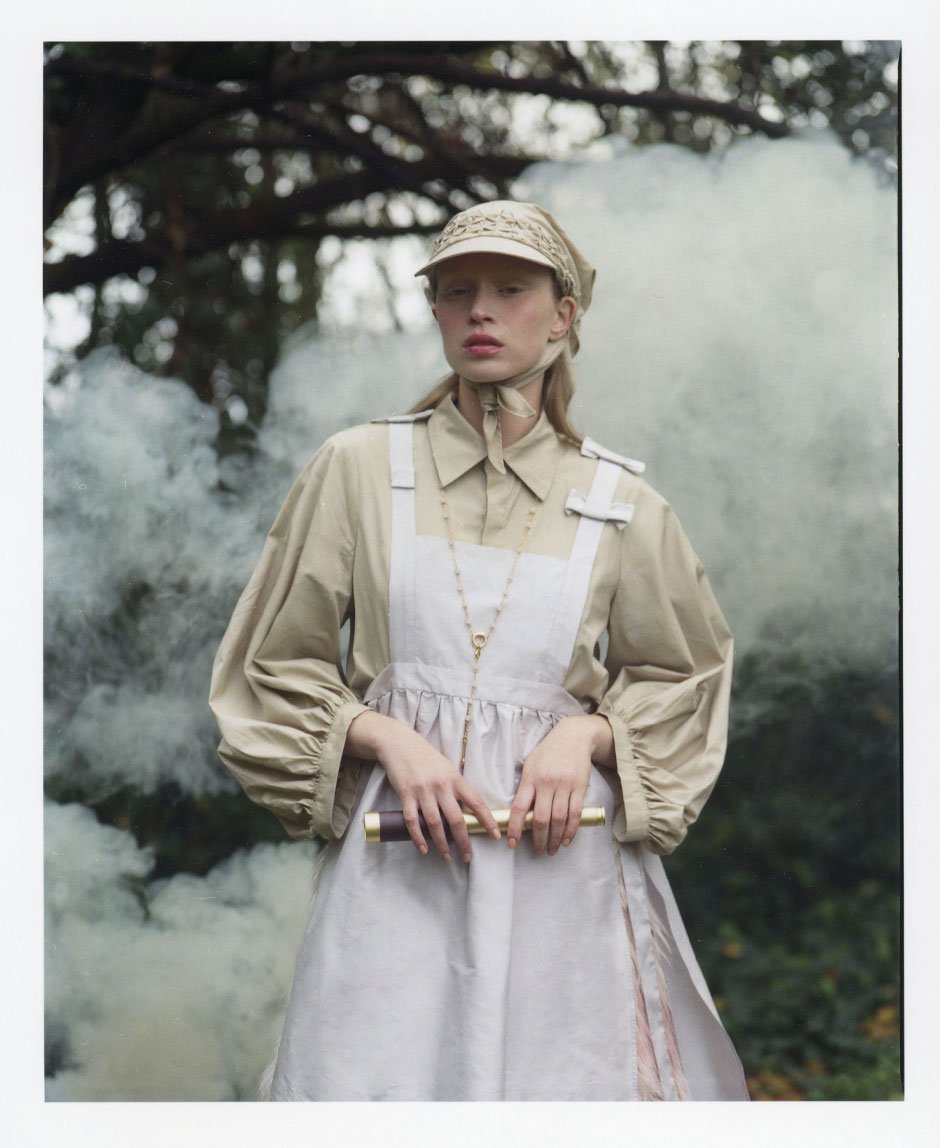 apron by 19.04WORLD, shirt and hat by ARMARGENTUM, skirt by BARBARA BOLOGNA, necklace by CAPSULE ELEVEN
