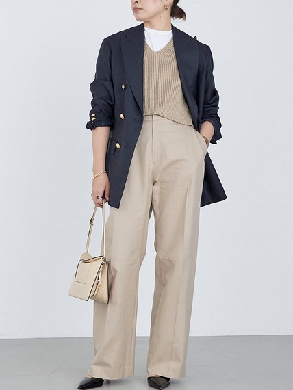 二つ目は、ブランドらしいモード感を利かせた仕事着とオケージョンスタイル。ブランドパーパスの「新しいスタイルを提案したい」思いと、もっと伸ばせそうな芽を感じていることから、改めて力を入れる。イチ押しはセットアップ。定番のスラックスにそれぞれ共地でトップを作った。例えばジレは後ろのウエスト部分にパニエを仕込んでおり、着ると後ろ身頃が華やかに広がる。コンサバティブに収まらない個性が光る。