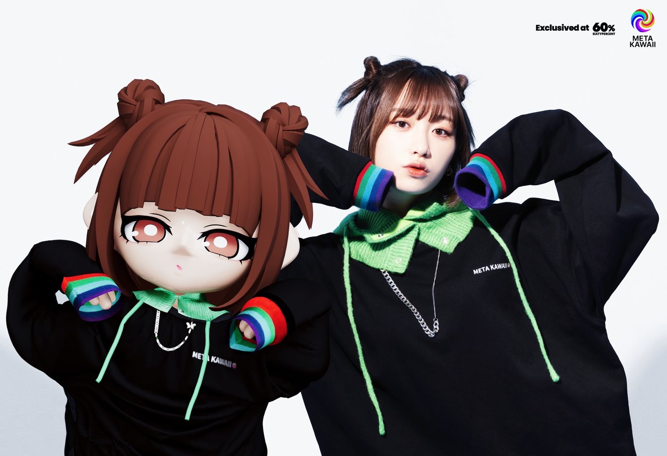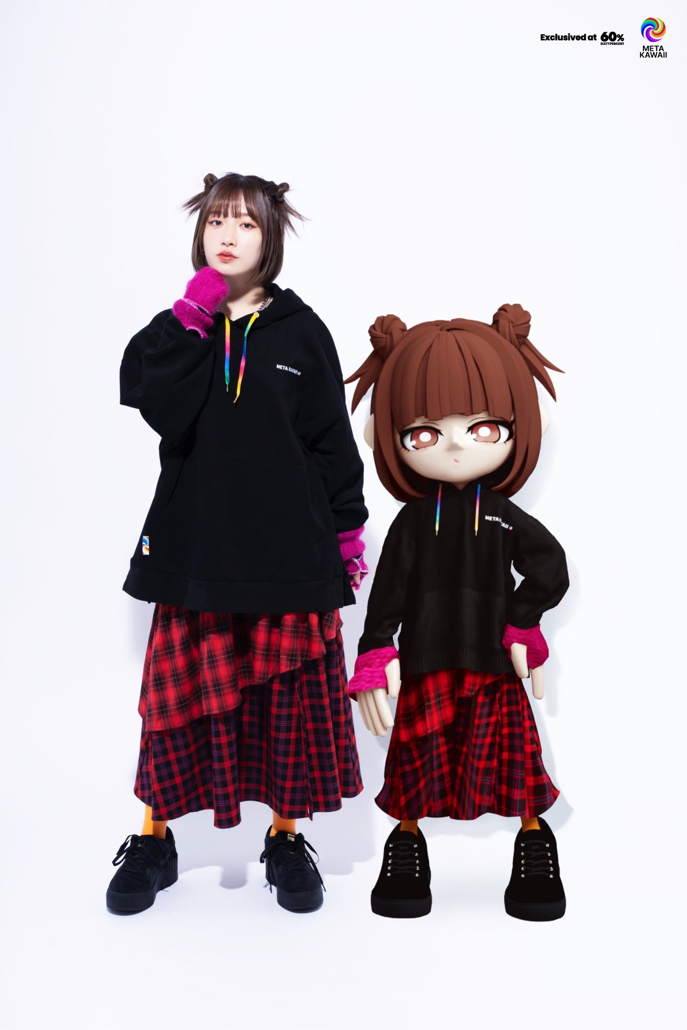そんな「META KAWAII」は、NFTだけにとどまらず、アバターと連動したアパレルアイテムの販売を2022年12月に発表した。モデルに吉田凛音を起用し、Z世代に人気の高いECサイト「60%」でスウェットとフーディーを販売している。購入すると、アバターにも同じ服を着用させられる仕組みだ。