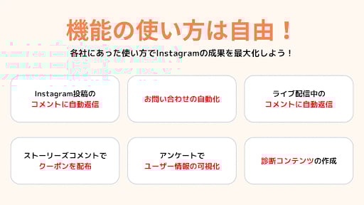 L-Buzzはこの問題を解決するための機能を多く備えています。まず、Instagramの公式APIの活用で、アカウントの凍結リスクをなくしつつ、コメントへの自動返信・DMでの自動返信ができます。
