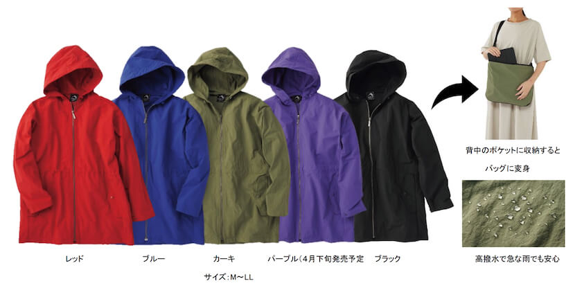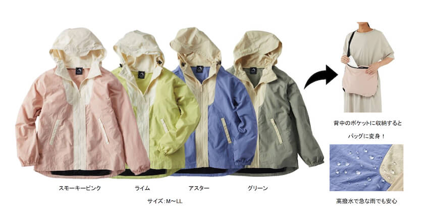 人気の「トランスフォーム」シリーズは、ポケッタブル機能でジャケットがショルダーバッグに変身し、荷物を収納することが可能な製品だ。旅行やアウトドアシーンで活躍する当シリーズから今回は新作の「トランスフォームマウンテンパーカー」(2,900円)と「トランスフォームフードジャケット」(1,900円)、そして昨年の大ヒットから更なる進化を遂げた「トランスフォームジャケットEX」(2,500円)がラインアップする。全3型が高撥水機能で急な雨にも対応が可能。さらにUVカット、背中のベンチレーションで衣服内のムレを軽減してくれる。