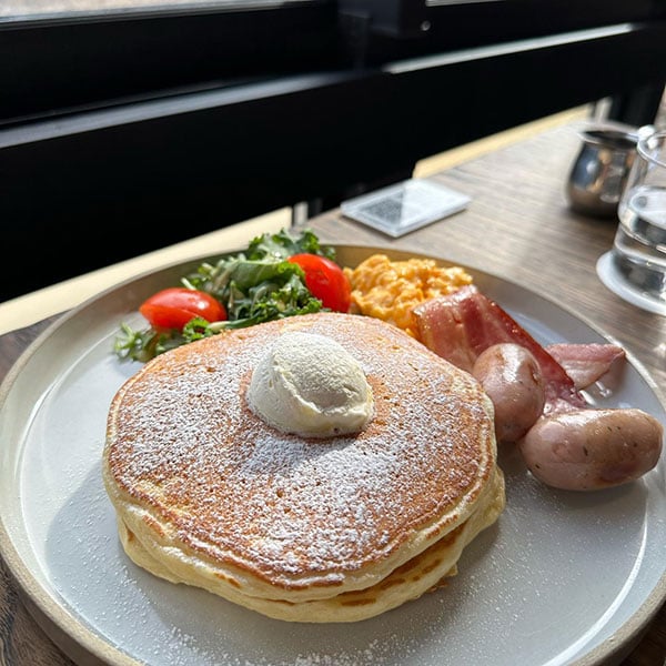 看板メニューは『バターミルクパンケーキ』。ランチには、ベーコン、エッグ、ソーセージ、ケールサラダが付いた『バターミルクパンケーキコンボプレート』(2200円)が良いかもしれません。
