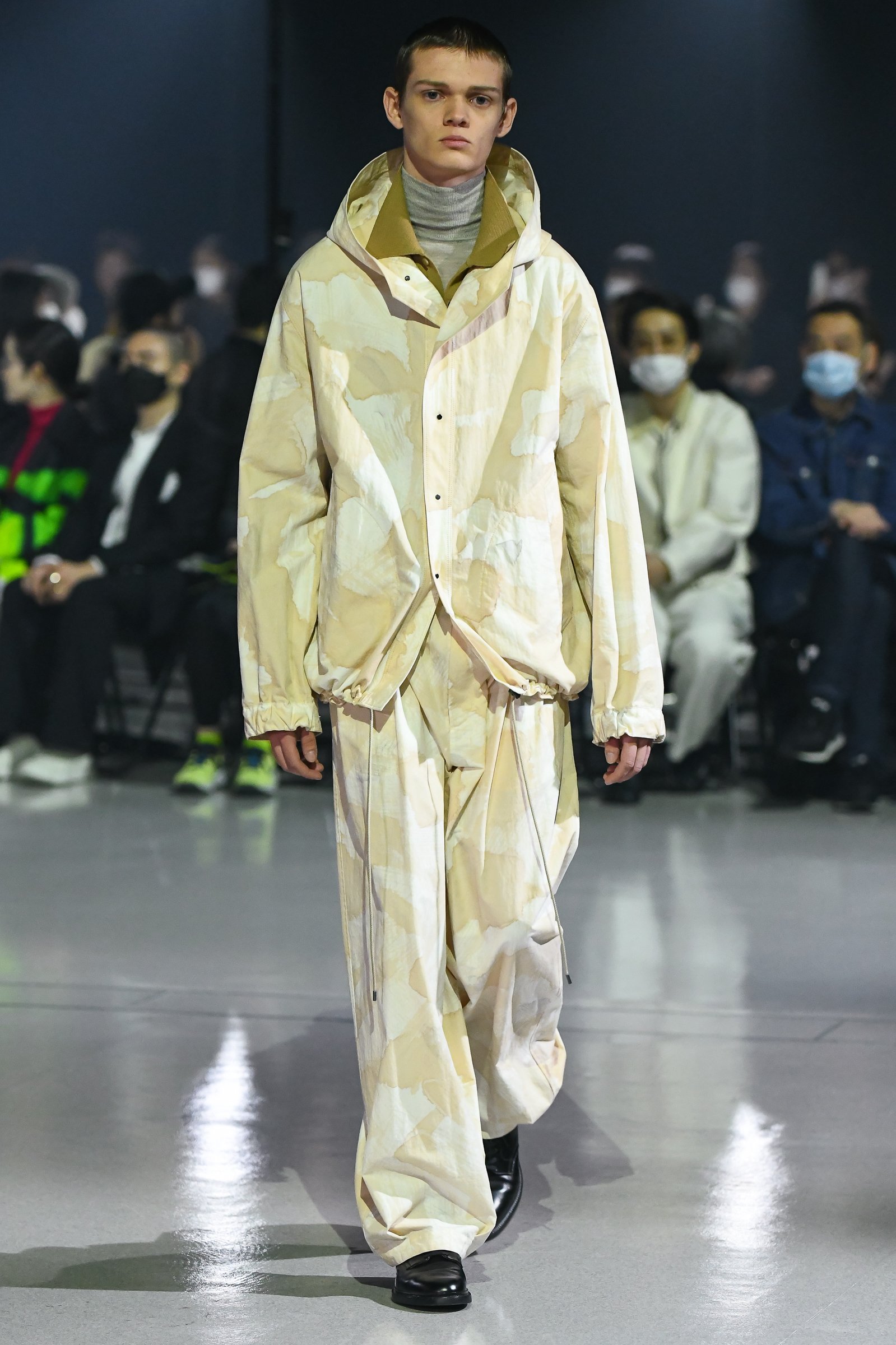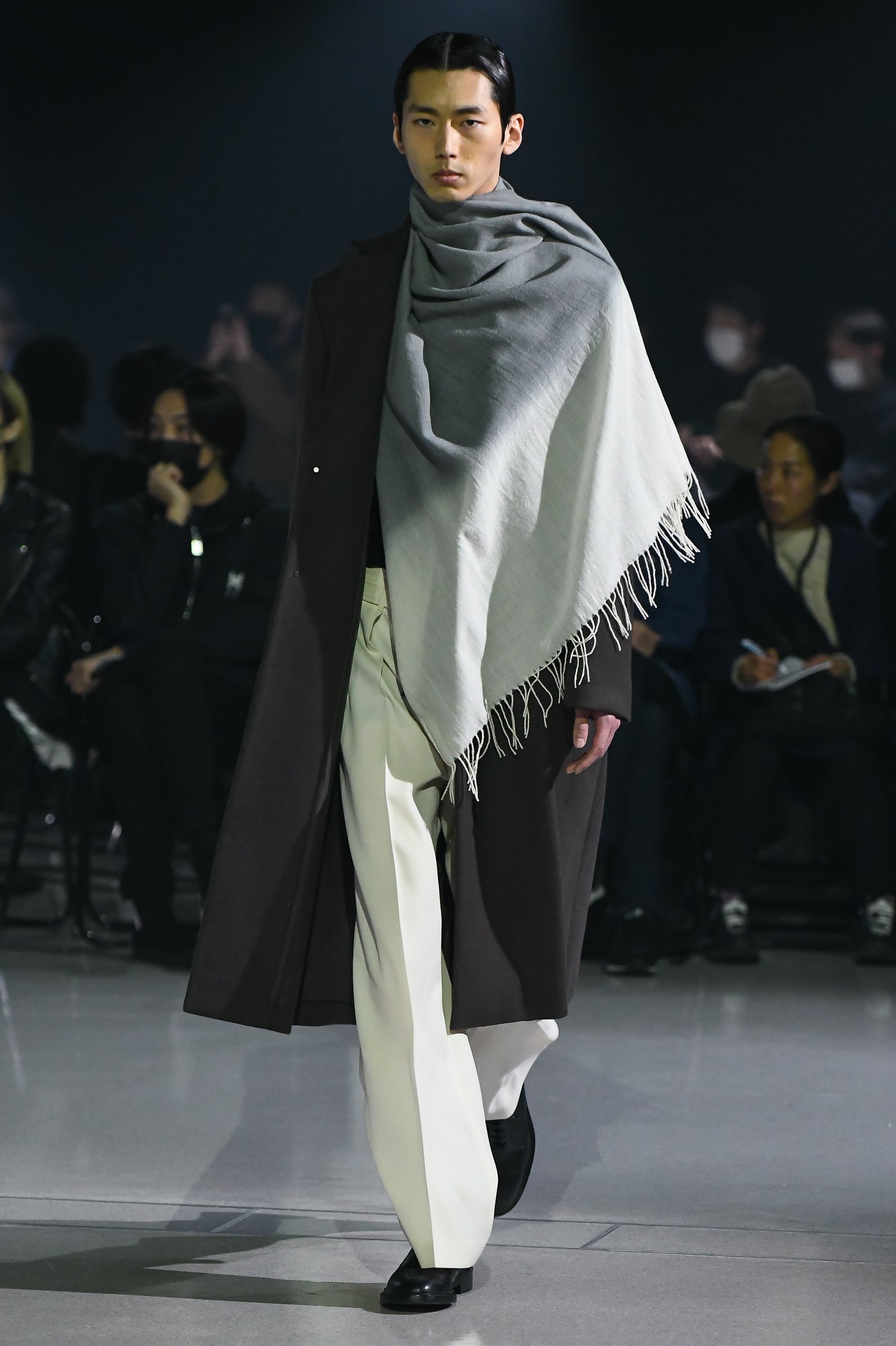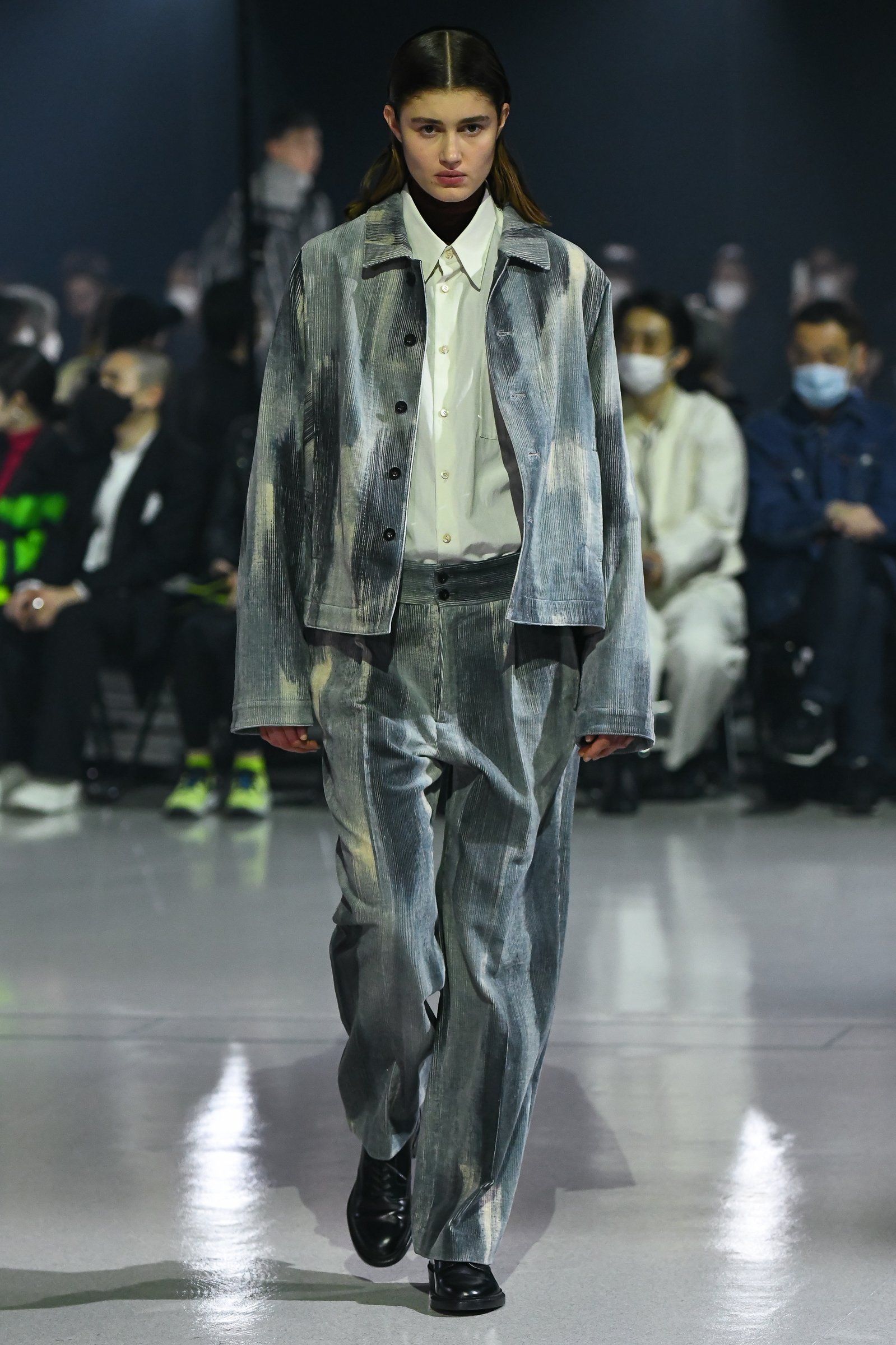ランウェイショーは、暗転後、朧月明かりを想起させるぼんやりとした光が浮かびあがりスタート。京友禅の職人の手で刷毛染めされたストールは、染料が生地に染み込む具合を自然のままに委ね、人が手を加えすぎないようにすることで、自然が作り上げるものと職人の手仕事との美しいバランスを追求した。同様に刷毛染めされたコーデュロイのセットアップは、表面にしか色が付けられない通常のプリントとは異なり染料が染み込むことでレイヤーが生まれ、奥行きのある色味で仕上げられている。柿渋染めのベージュのセットアップは、酸化することで色味が変化していく、経年変化が楽しめるアイテムとなっている。