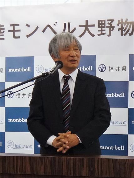 完成披露会であいさつしたモンベルの辰野勇代表取締役会長