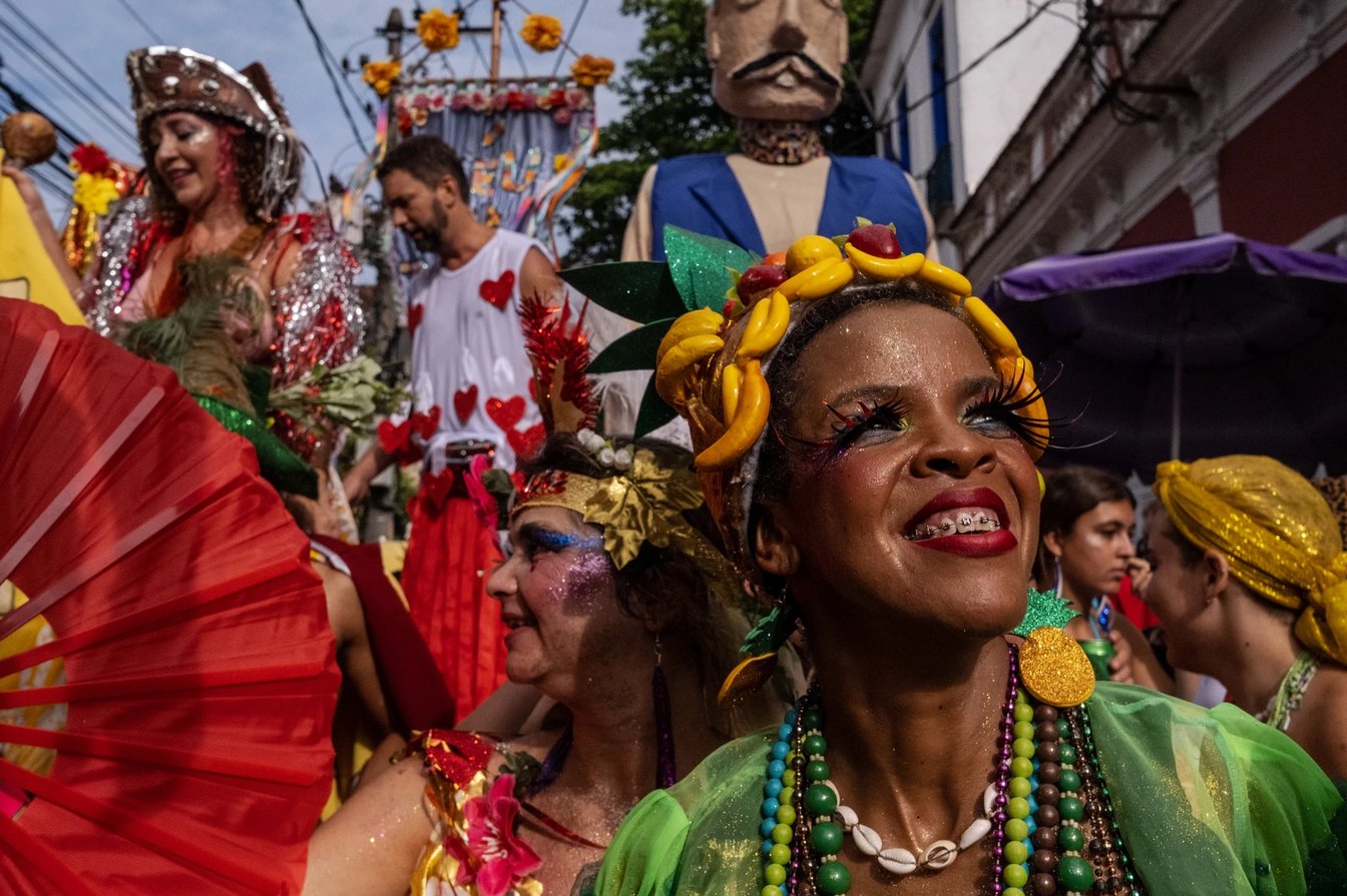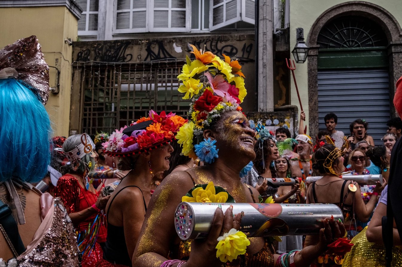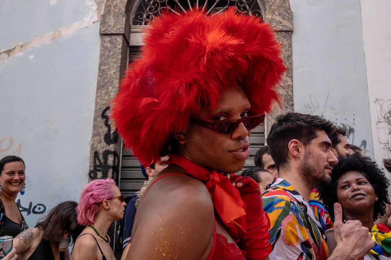 青のハットにキラキラ光るネクタイをつけた、いかめしい白髪の60代の男性が、熱心にバスドラムを叩き始めた。その隣では、ネオングリーンのサングラスをかけた男性が、ルーラ大統領の選挙ステッカーが貼られた鍵盤ハーモニカに唇をつけた。時計の針が7時45分を指すと、有名な地元出身のサックス奏者のタレス・ブラウン(Thales Browne)が、ちょうどセルジオ・サンパイオのヒット曲「Eu Quero É Botar Meu Bloco Na Rua」の最初の1小節が始まる瞬間に現れた。ブロッコの始まりだ。