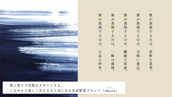 『筆と香りで空間をデザインする。しなやかで美しく生きる人と共にある生活雑貨ブランド』がコンセプトの「chacia」。同ブランドは、しなやかで美しく生きる20~30代をメインに、日々の暮らしで自分らしさを表現できる生活雑貨を提供する。それを叶えるべく、日本が誇る魅力の一つである“筆”の質感に注目し、デザインに採用している。