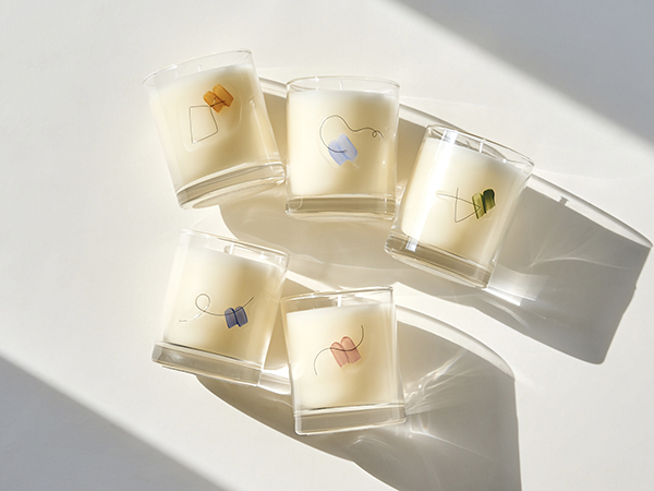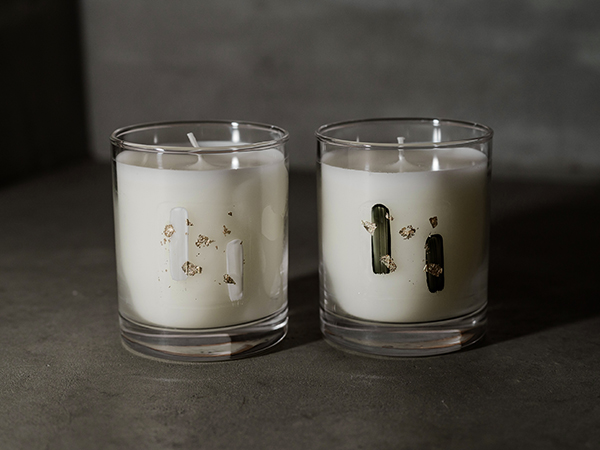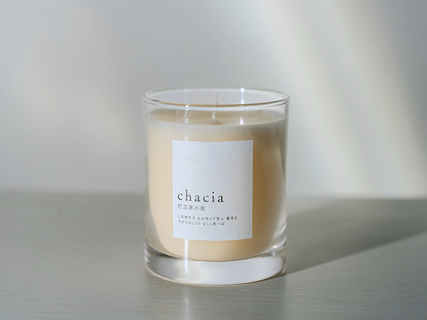 キャンドルのワックスには植物由来の成分を配合。香りは2種類あり、ラベルデザインの「chacia candle」は樹木、筆を用いたデザインキャンドルは抹茶の香り。樹木はボルネオール・ライラック・サンダル・ジャスミンが、「菩提樹」の甘く官能的な花の香りを表現。抹茶はリーフグリーン・ペアー・ミューゲ・ジャスミン・ローズが、高級感を与えるオリエンタルなお茶の香りを表現している。