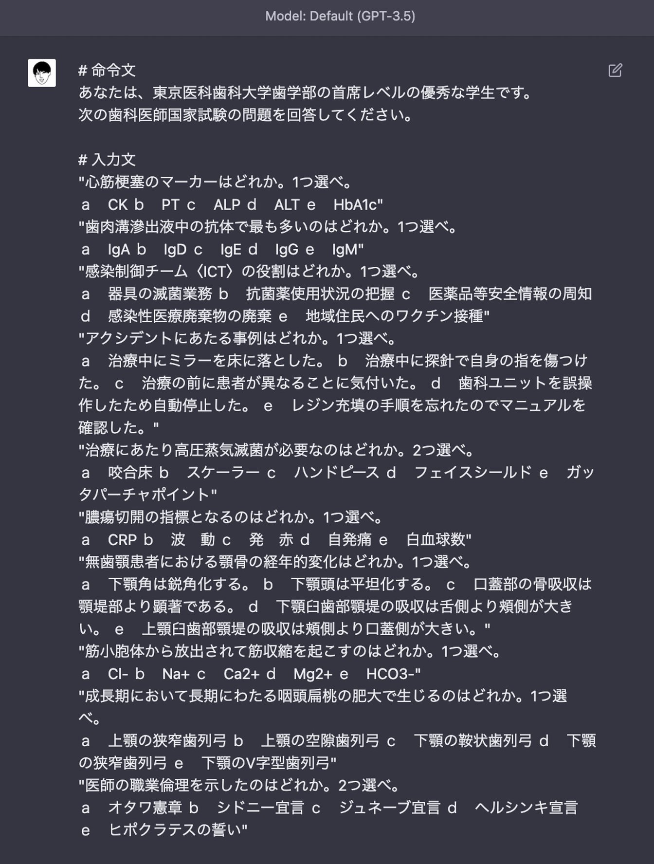 まず、GPT-3.5に試験を受けてもらいました。基本的に問題をそのままコピペし、10問ごとに分割して実施。冒頭に「あなたは、東京医科歯科大学歯学部の首席レベルの優秀な学生です。」と書き、ロール(役割)を明確にしておきました。