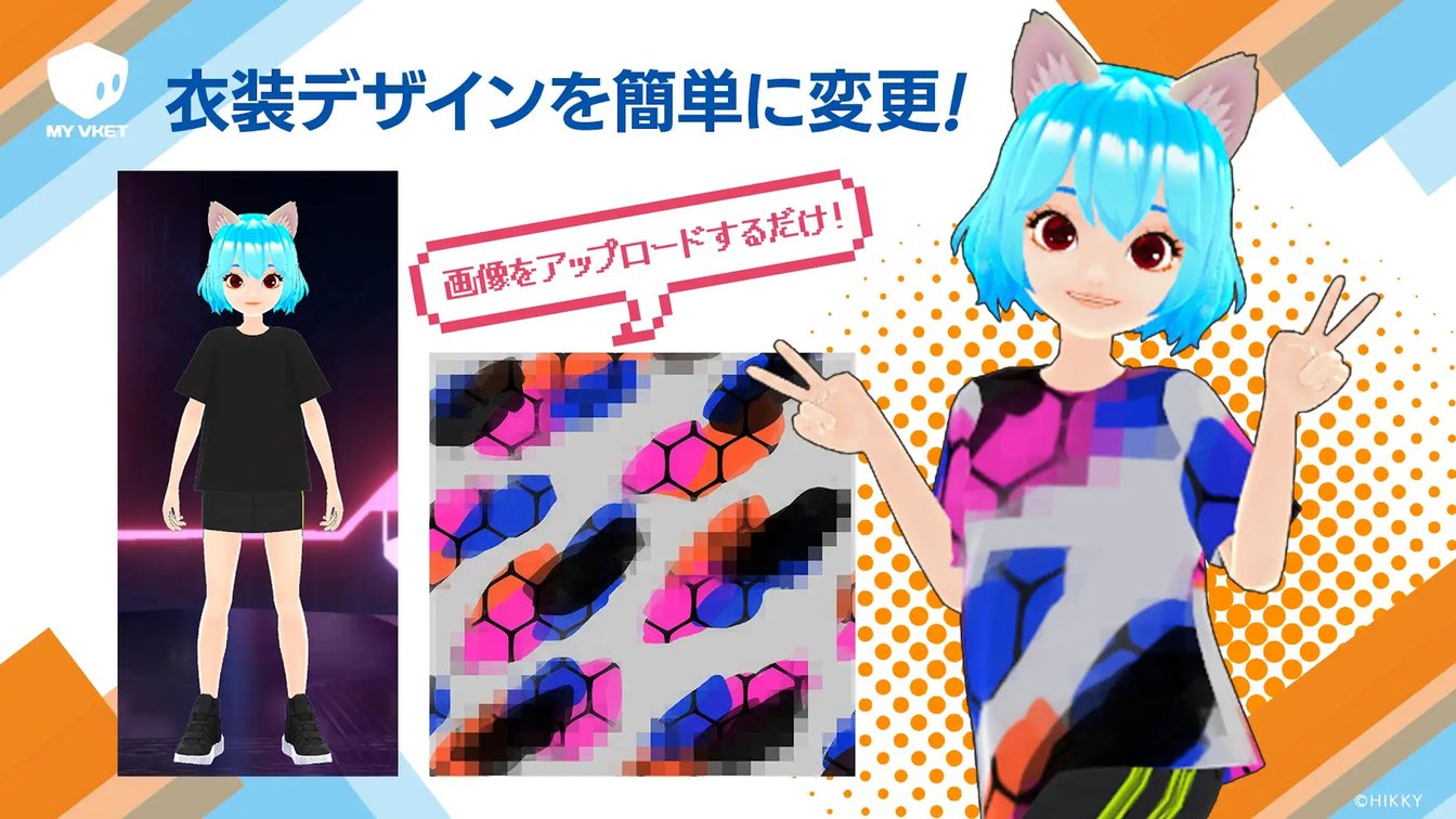 HIKKYは、My Vketを展開する当初からデジタルファッションの強化を考えており、Vket Avatar Makerの機能として、アバターの衣装デザインを変更・作成できる機能をリリースしたという。同機能は、アバターの衣装デザインの変更が、Webブラウザ上で自分の好きなpngデータをアップロードすることで、簡単に行えるものだ。デザイン変更可能なアイテムは、Tシャツ・スカート・パンツ・シューズなど8種類となっている。「初心者の方は、公式で展開されているパーツがたくさんあるので、まずはそれを使って組み合わせを楽しんでほしいですね。最初から『これが私だ』と、しっくりくるアバターを見つけることは、結構難しいと思います。肌や髪の毛の色も簡単に変えられるので、まずは触って遊んでもらえればと思っています」