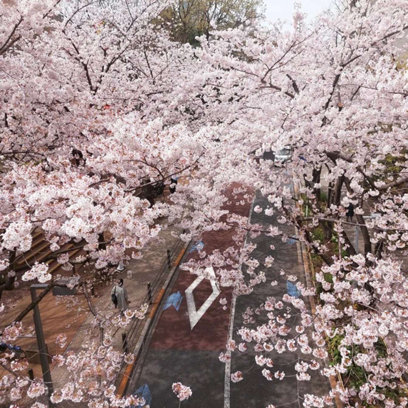 道を覆うように咲き誇る桜並木のアーチが、約400mにわたり続いています。歩道橋の上から見ると、まるで桜の海。