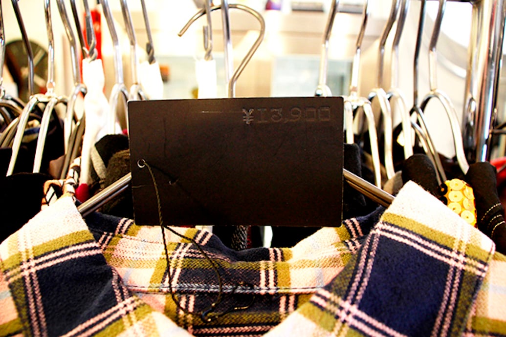 服の値札はインクを使わず空押しで価格を表示。あえて価格を見え辛くしているのは、まずはそのものの価値を自らで感じ取ってほしいという想いがあってのこと。