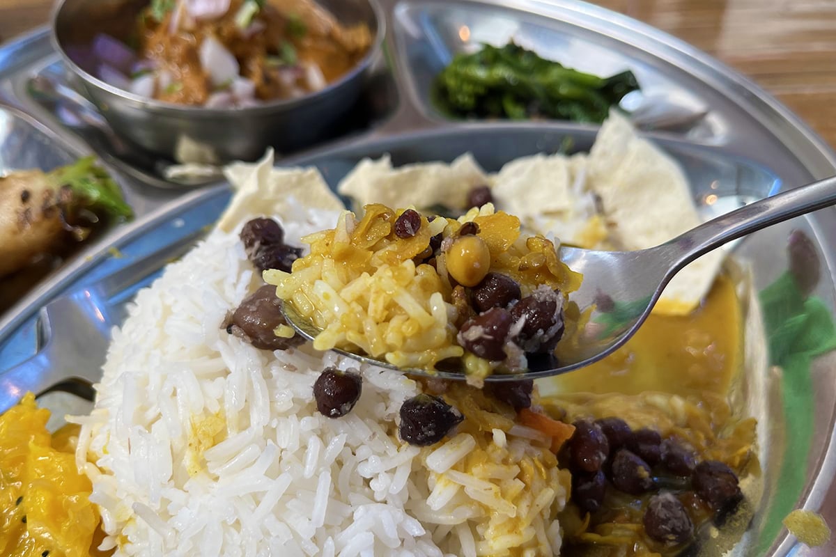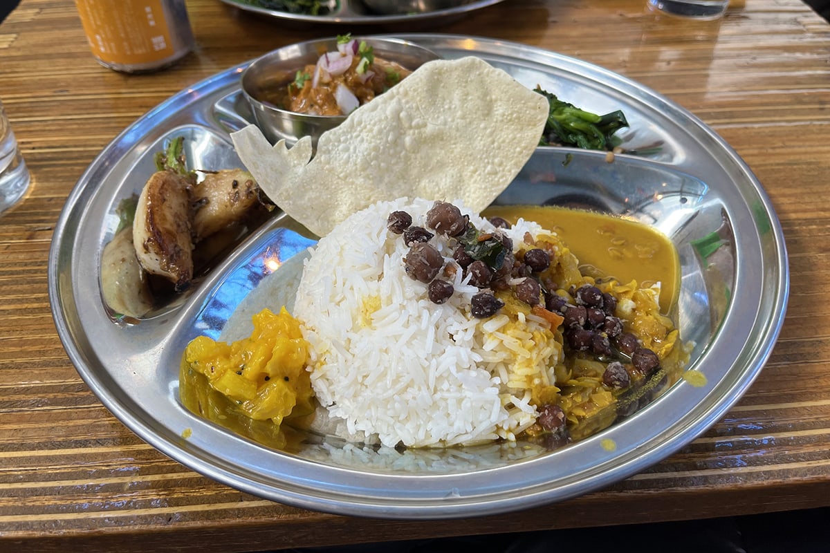 色はいわゆる普通のカレー色。食べてみるとびっくり濃厚なバターチキン!独自の新チューニングとのことで、付け合わせのアチャール(インドのピクルス、漬物的な)との相性も当然バッチリ。パパド(インドのおせんべいみたいな)をバリバリ割ってカレーソースとともに食べれば、おいしすぎて幸せだ。