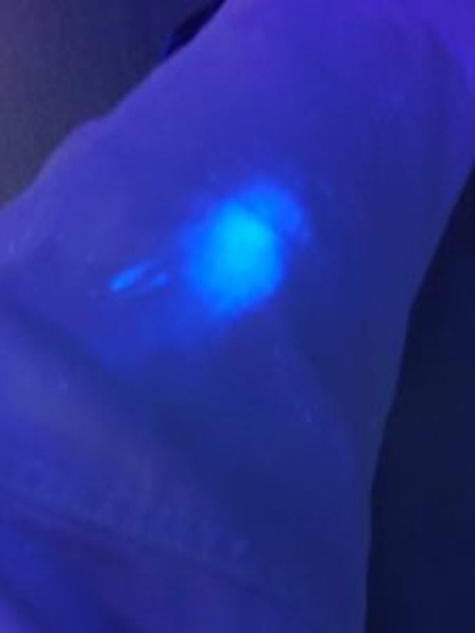 家に帰ってよく見ると青白く光っていた部分は黒っぽい汚れに見える物がありました。恐らくこの汚れを取るために(白くさせるために)蛍光増白剤入りの何かで擦ったと予想されます。