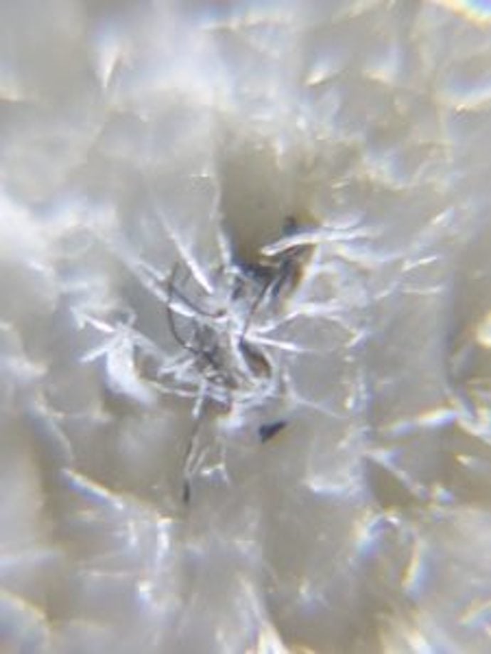 そして今回のケースですが、よく汚れを観察すると何かが付着した汚れに見えませんでした。拡大して見ると、所謂「飛び込み」という物で白い糸の中に黒い糸が巻き込まれていました。
