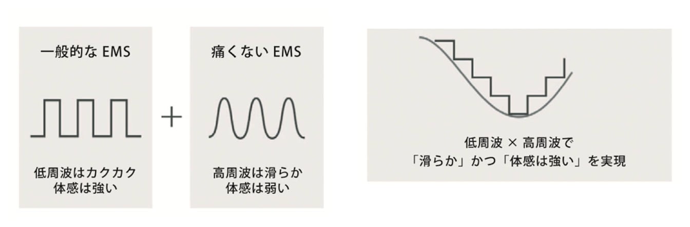 主に2点ありまして、1つは痛くない独⾃の複合波を搭載しているため長時間快適に使用できるように配慮して開発されたところになります。この美顔器を使用すると、筋肉がやさしくマッサージされているような、心地よいリラックス感が得られます。製品が不快感や痛みを引き起こす場合は、効果があっても継続することが困難です。そのため、使用しやすく快適であることを優先しています。