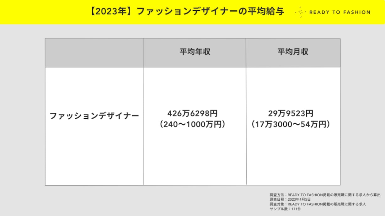 今回は、弊社が運営するファッション・アパレル業界特化型の求人プラットフォーム「READY TO FASHION」に掲載された171件超の求人情報(2023年4月5日時点)から得られた情報をもとに、ファッションデザイナーの平均年収、月収を算出しました。