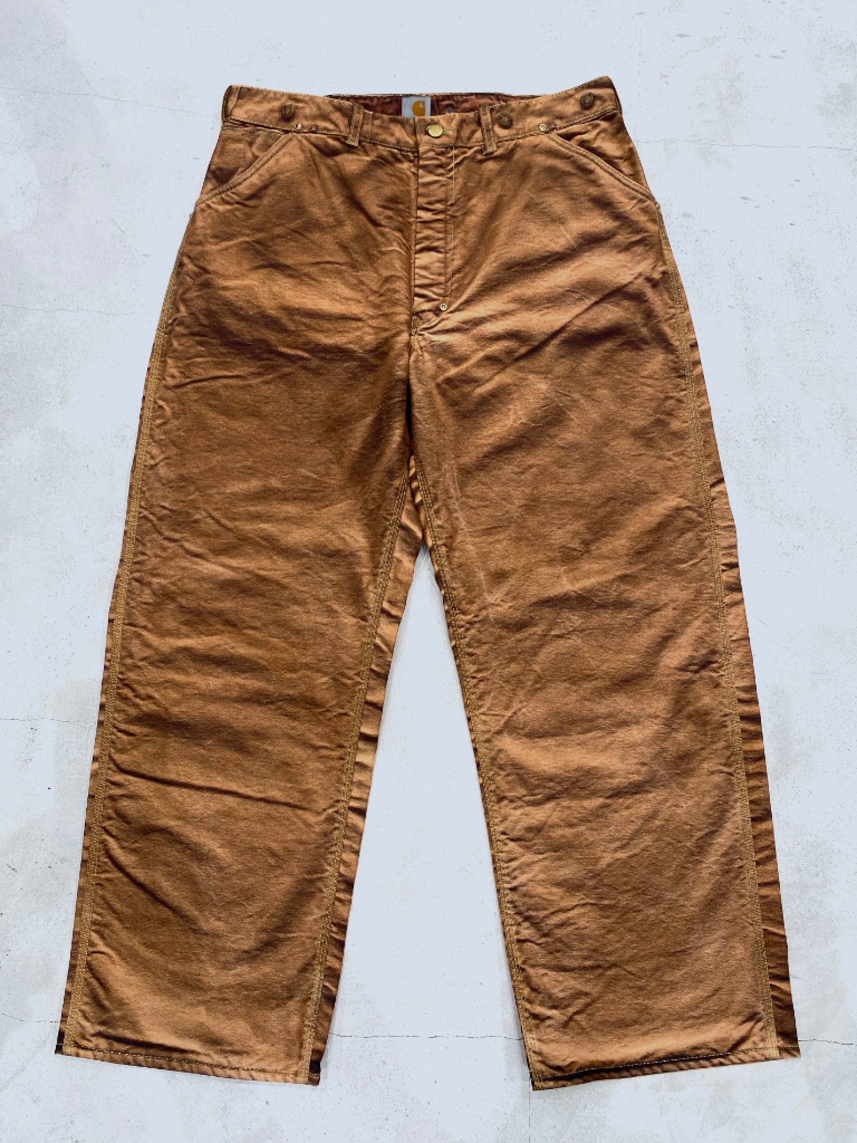 リーバイスのヴィンテージデニムシリーズとして、ウエストがドローコード仕様となったコットンツイル生地のパンツをベースに、1960年代の「Levi’s 551ZXX」を用いてインディゴの色落ちやクラッシュ、欠損した紙パッチなどのディティールを転写プリントした新モデル(6万6000円)も展開。併せて、「Carhartt(カーハート)」による1950年代に生産されていたブラウンダックのワークパンツをプリントし、履き込んだダック地の風合いやウエストにサスペンダーボタンを再現したパンツ(6万6000円/いずれも税込)を揃える。