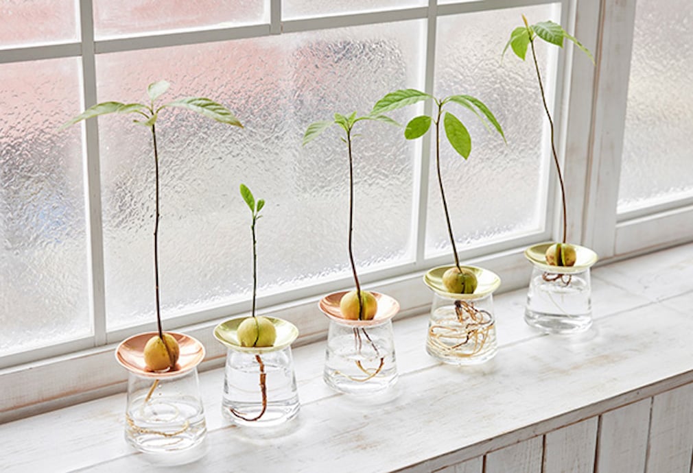 「アボカドVase」(発根済みの種付き 税込4400円)は、発根済みのアボカドの種と、器やフタのセットです。