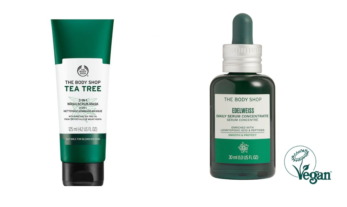 右:洗顔、フェイススクラブ、フェイスマスクの3つの方法で使える画期的なスクラブ洗顔料。『3-IN-1 ウォッシュ.スクラブ.マスク TT』125mL 3,410円(税込)、左:環境ダメージに立ち向かうしなやかな肌を目指して作られた、99%自然由来成分の美容液。『EDW コンセントレート セラム』50mL 8,360円(税込)