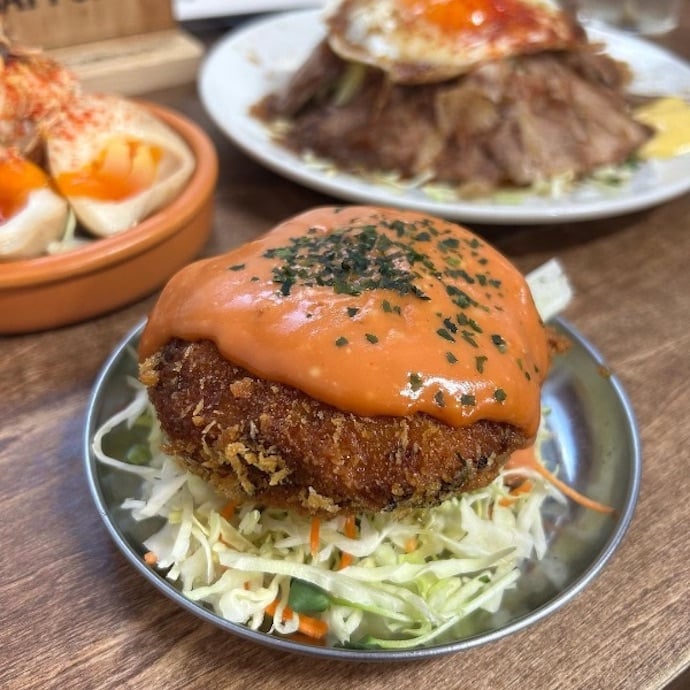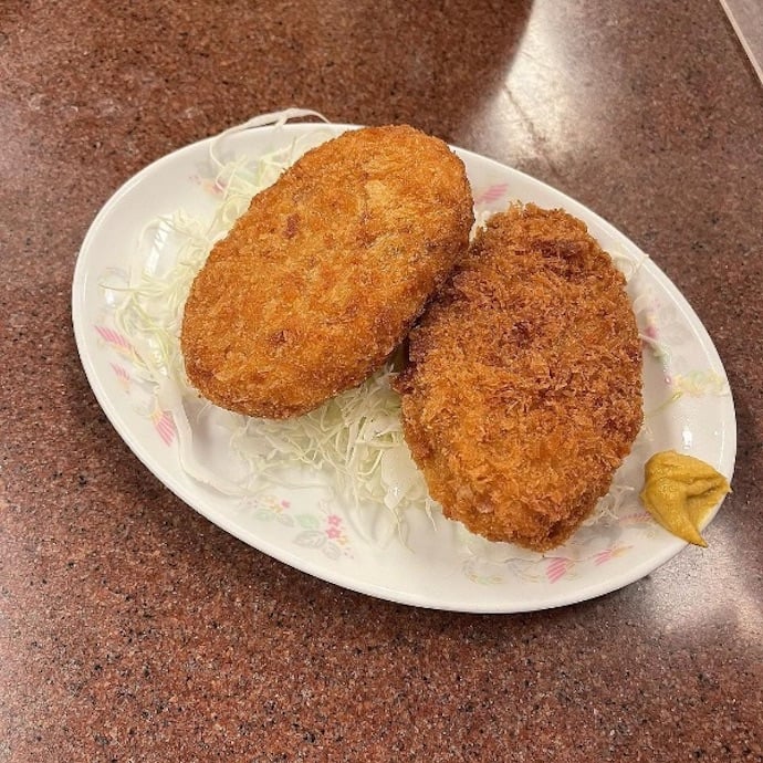そのだの人気メニューのひとつである大ぶりの「メンチカツ」は、肉汁が飛び出す程のジューシーさ。こってりした揚げ物はビールとの相性抜群ですよ。