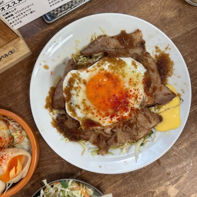こんもり盛られた千切りキャベツにチャーシューが乗った「チャーシューエッグ」はボリューム満点。メニューの大半が300〜600円台とコスパ抜群なのも嬉しいんです。