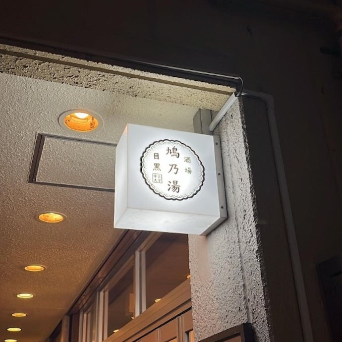 3つ目にご紹介する「鳩乃湯」は東急東横線・学芸大学駅から徒歩2分程にある大衆ネオ酒場。こちらの四角い看板が目印です。
