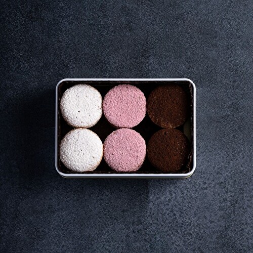 缶の中には和三盆、苺、黒胡麻の3フレーバーが6枚ずつ入っていますよ。