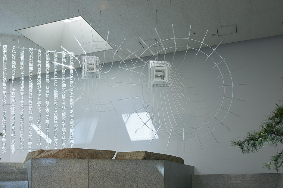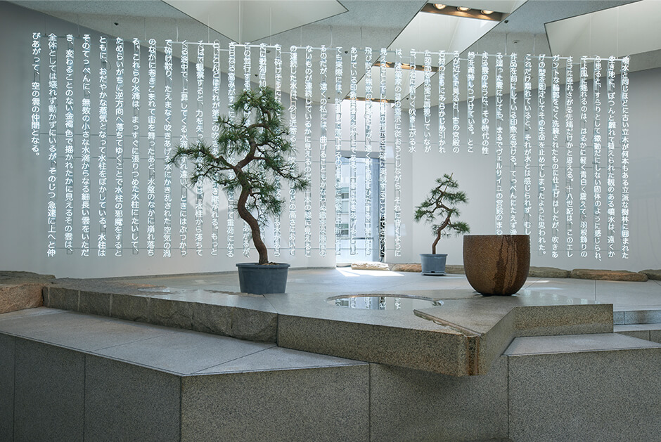 2018年に同会場にて開催された個展の第2章となる今展では、彫刻家 イサム・ノグチが制作した石庭「天国」に、床面から天井に達する光の柱作品と松の木が配される。