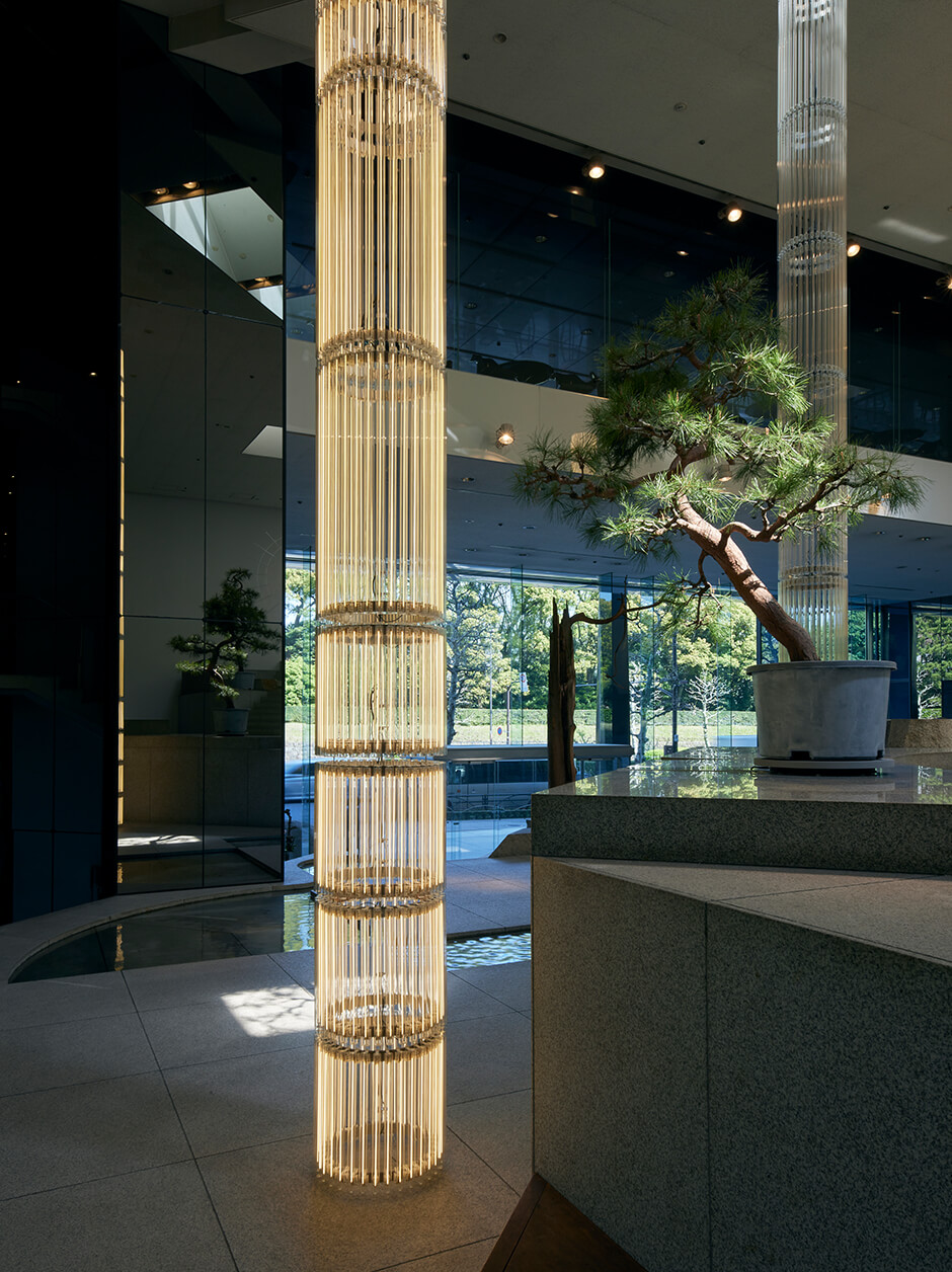ゆっくりと明滅を繰り返す光の柱は、石庭のタンブル(音色)を浮かび上がらせるテンポを生み、また能舞台に倣い石庭の適所に据えられた松の木は、その有機体としての存在から時間の「質感」を喚起する。