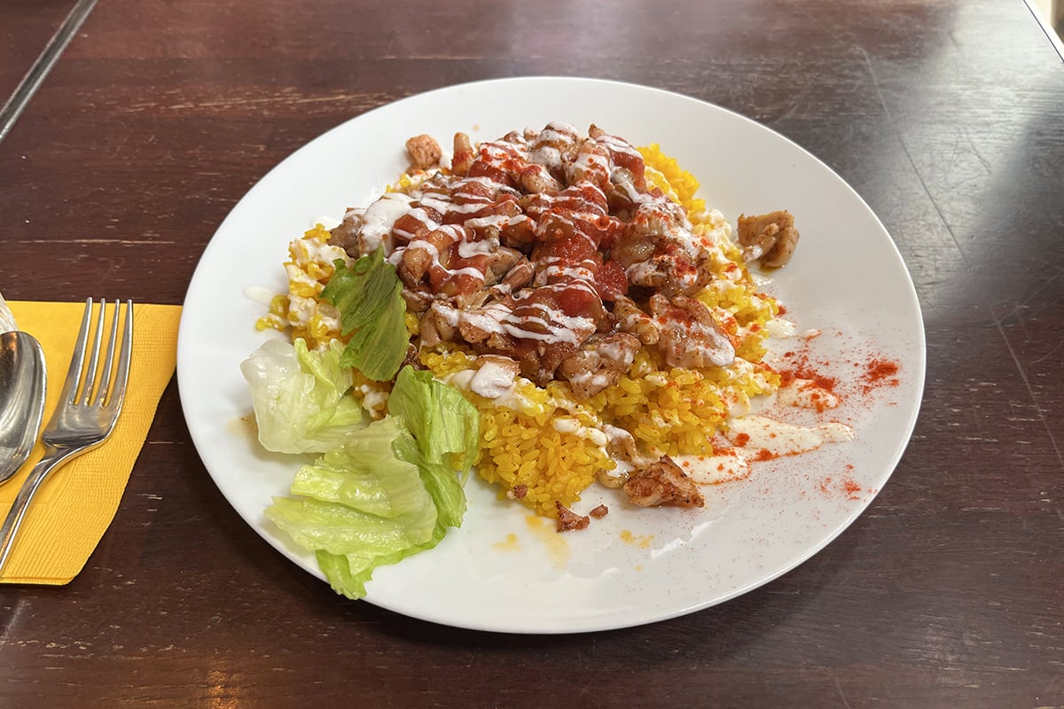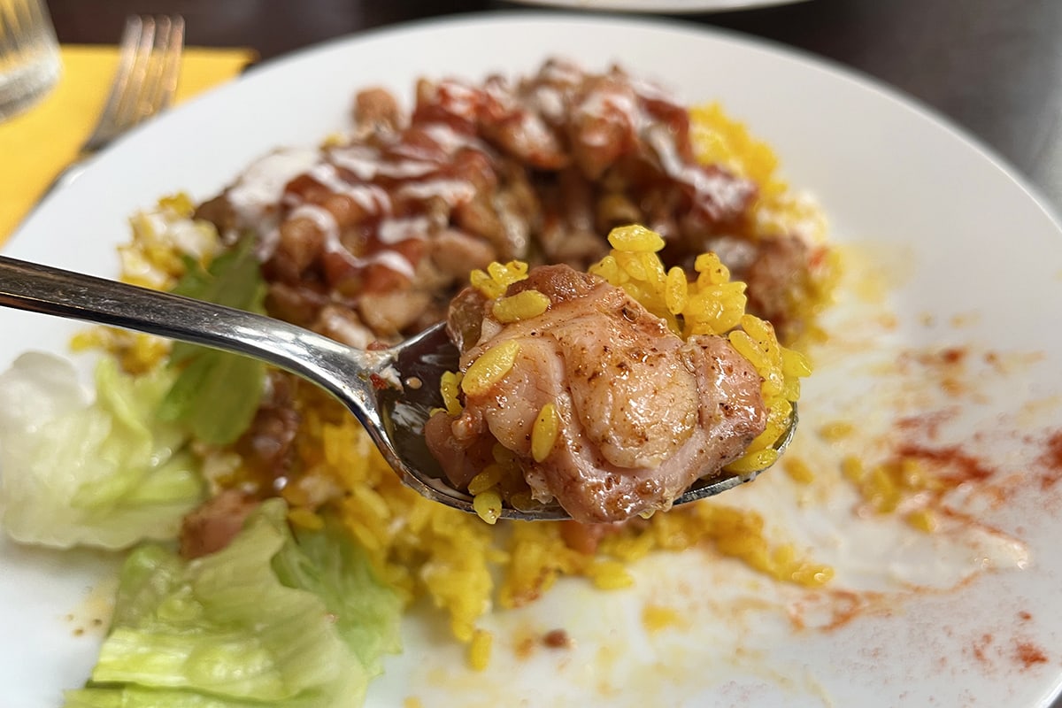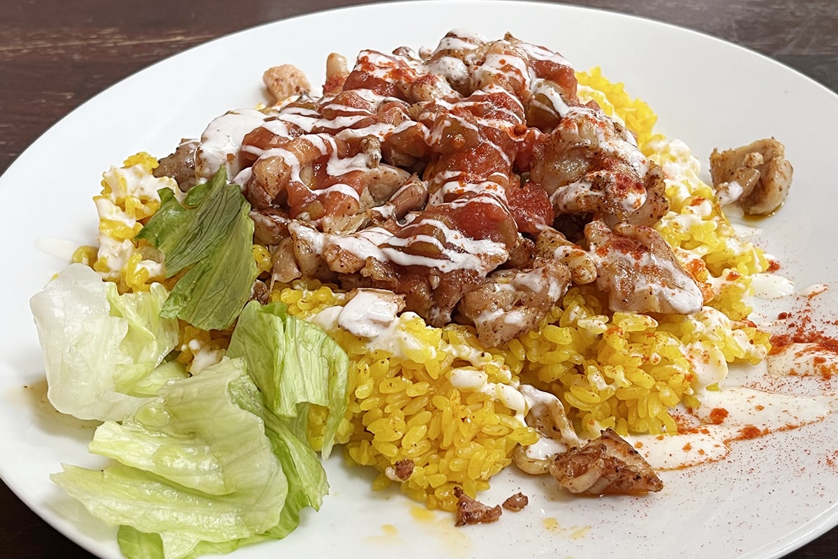 ほぐし系のボイルした鶏肉のチキンオーバーライスもおいしいけれど、BOOKS BUNNYのチキンオーバーライスはしっかりグリル系のプリプリチキンがたっぷり。黄金の絨毯のようなサフランライスの香りと見た目も食欲をそそる!