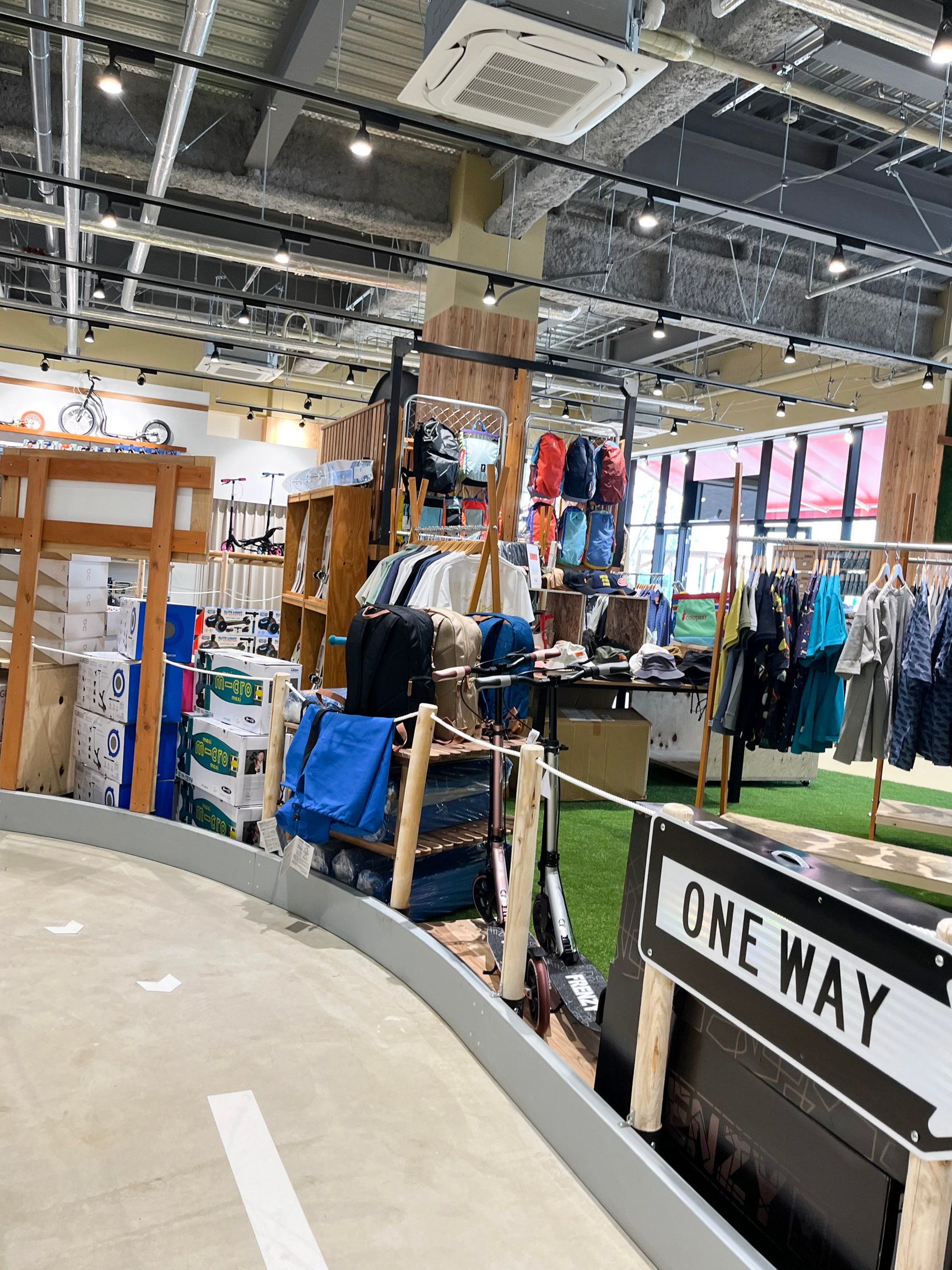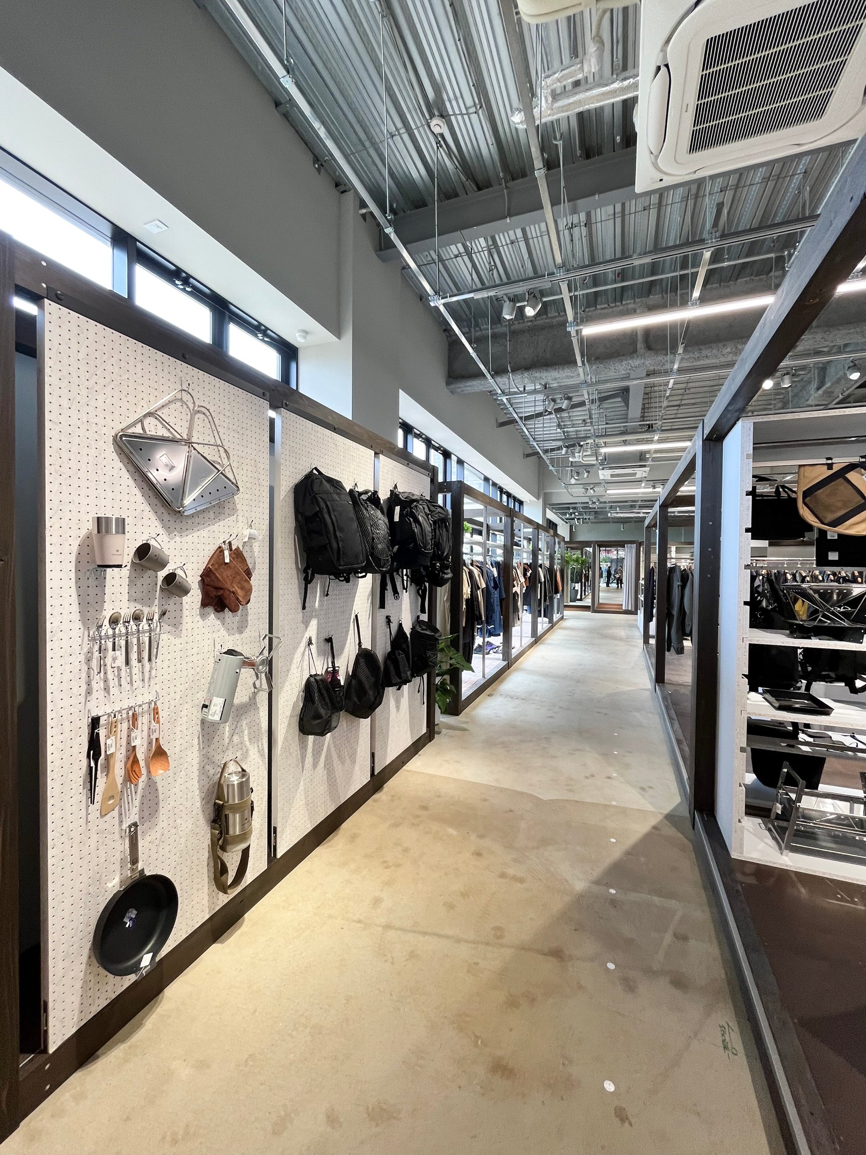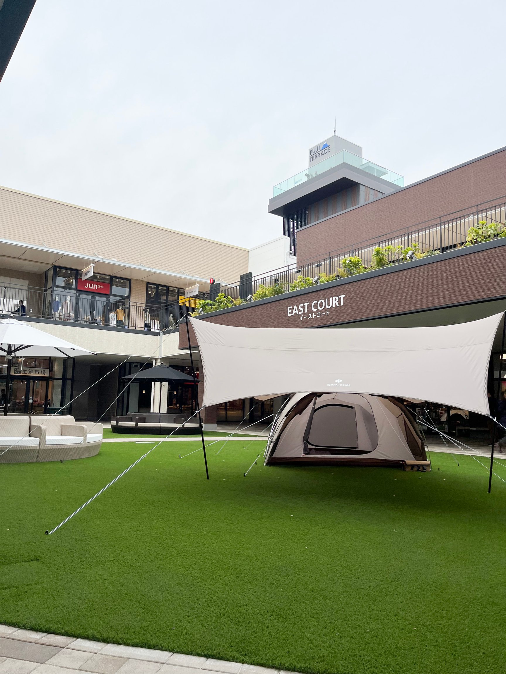 注目は、同施設の特徴でもあるアウトドアブランドの大型店が並ぶイーストコートエリア。目玉店舗の一つが、関東最大の売り場面積550平方メートルで出店した「スノーピーク(Snow Peak)」だ。キャンプギアからペットグッズ、キッズを含むアパレルまで600品以上をラインナップし、「カタログに掲載している商品はほとんど揃う」と同店。展示品のタープやテントの大きさや高さを見比べて購入できるのも大型店舗ならでは。テント設営講習や焚き火を楽しめる体験スペースを設けたほか、イーストコートの人工芝エリアでペグ打ち体験イベントも実施する。
