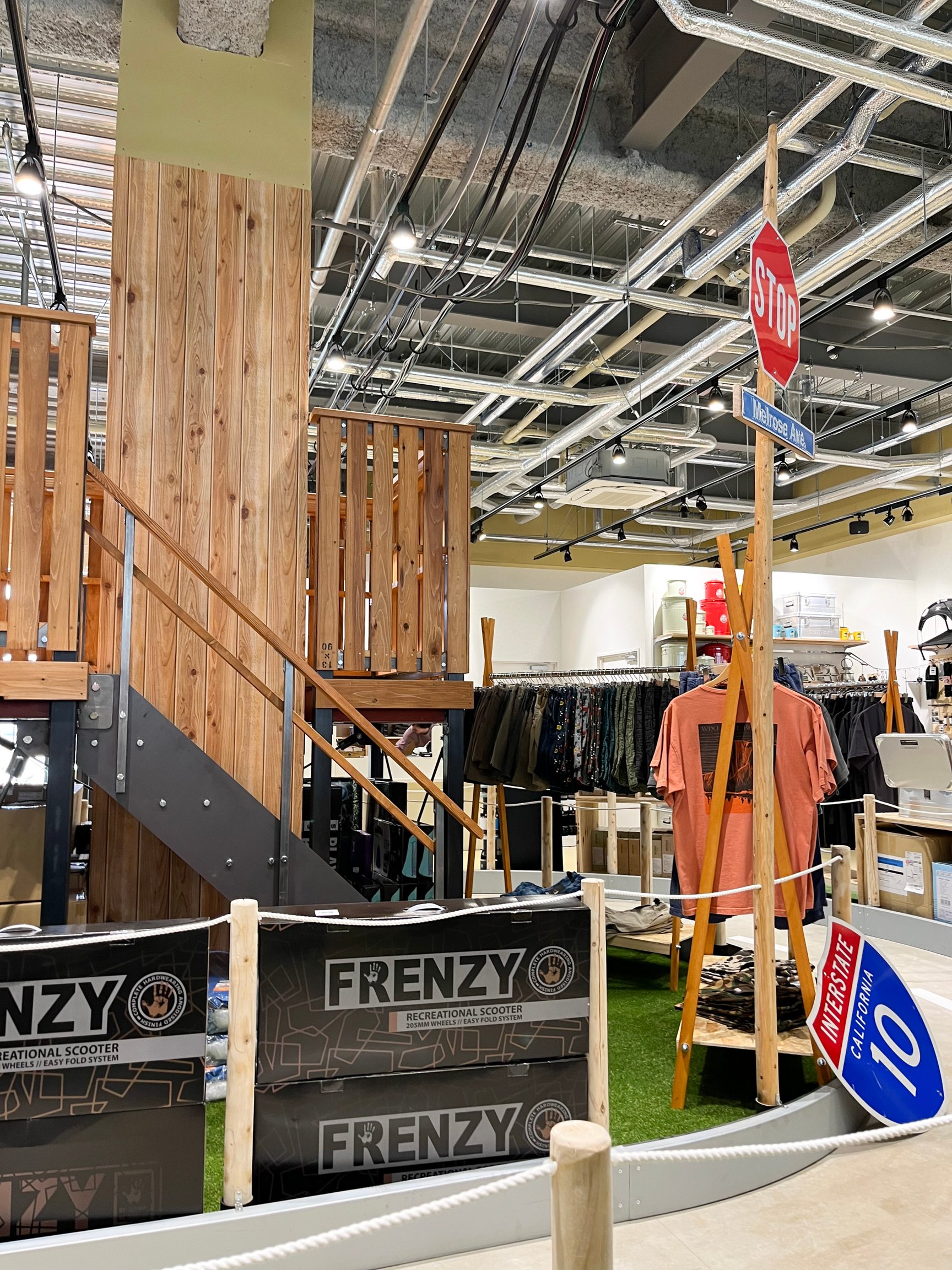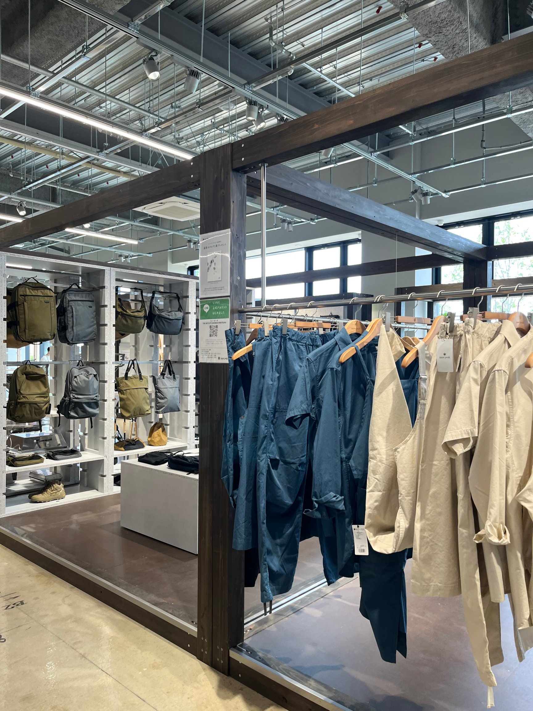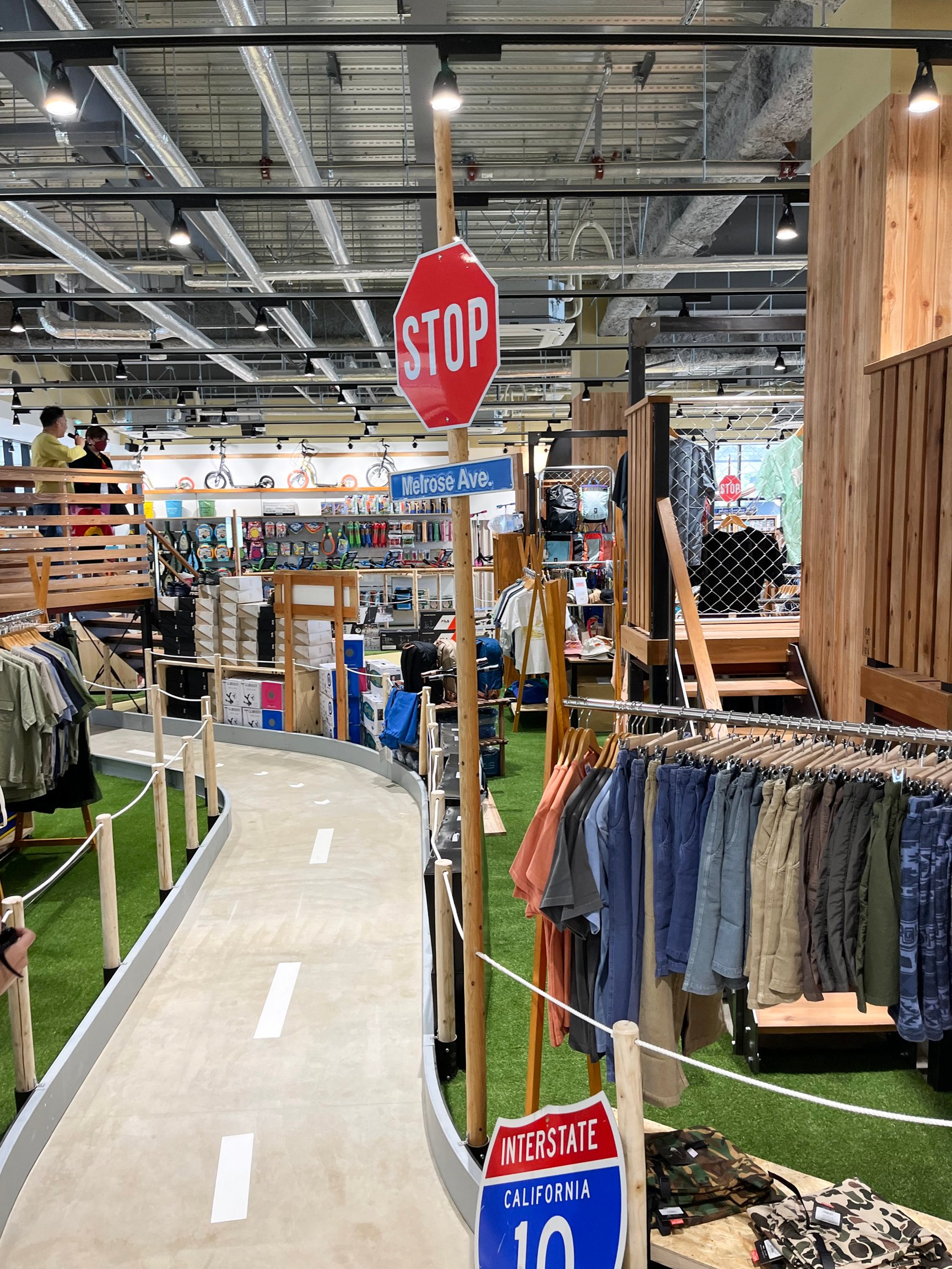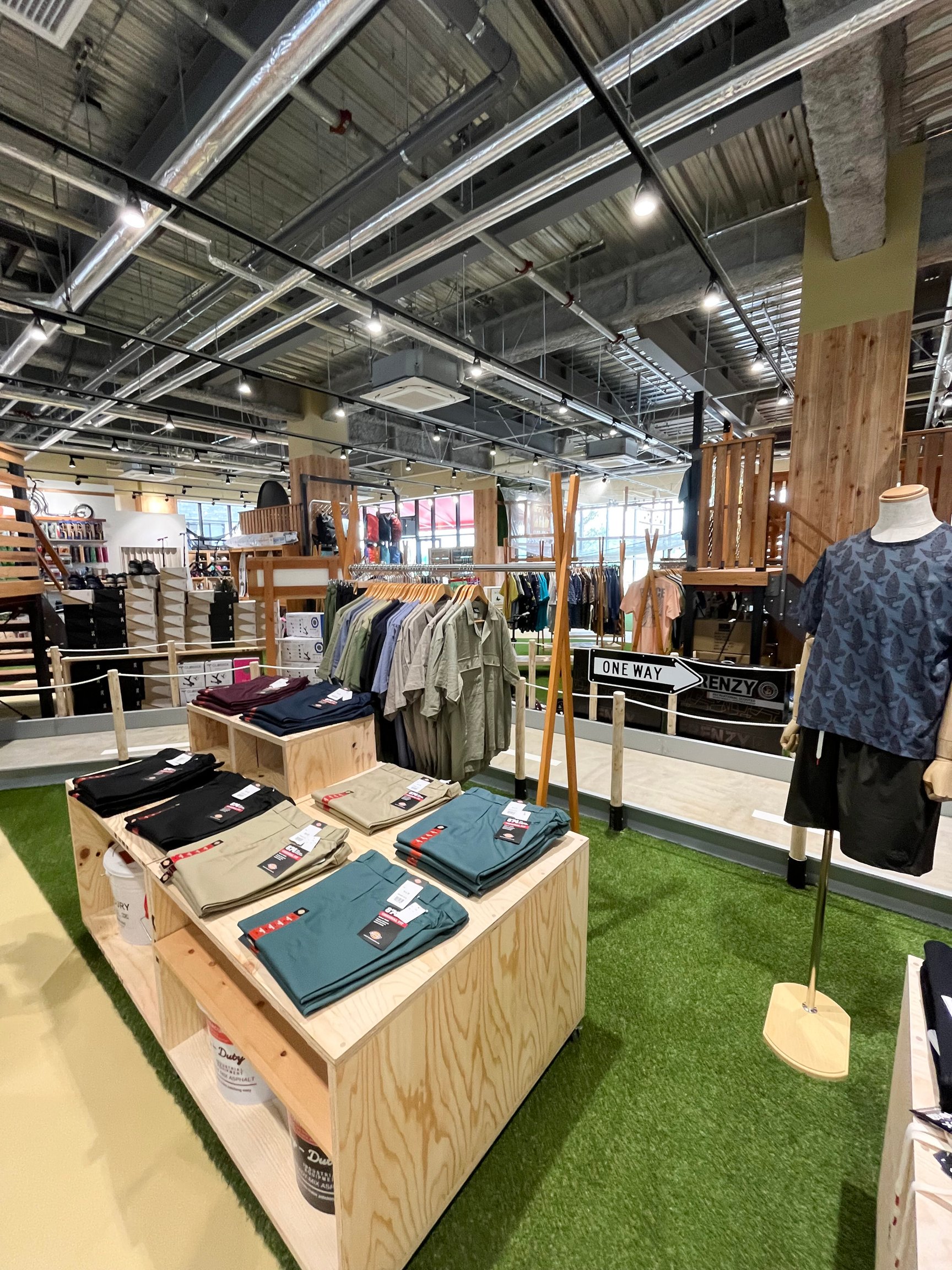 注目は、同施設の特徴でもあるアウトドアブランドの大型店が並ぶイーストコートエリア。目玉店舗の一つが、関東最大の売り場面積550平方メートルで出店した「スノーピーク(Snow Peak)」だ。キャンプギアからペットグッズ、キッズを含むアパレルまで600品以上をラインナップし、「カタログに掲載している商品はほとんど揃う」と同店。展示品のタープやテントの大きさや高さを見比べて購入できるのも大型店舗ならでは。テント設営講習や焚き火を楽しめる体験スペースを設けたほか、イーストコートの人工芝エリアでペグ打ち体験イベントも実施する。