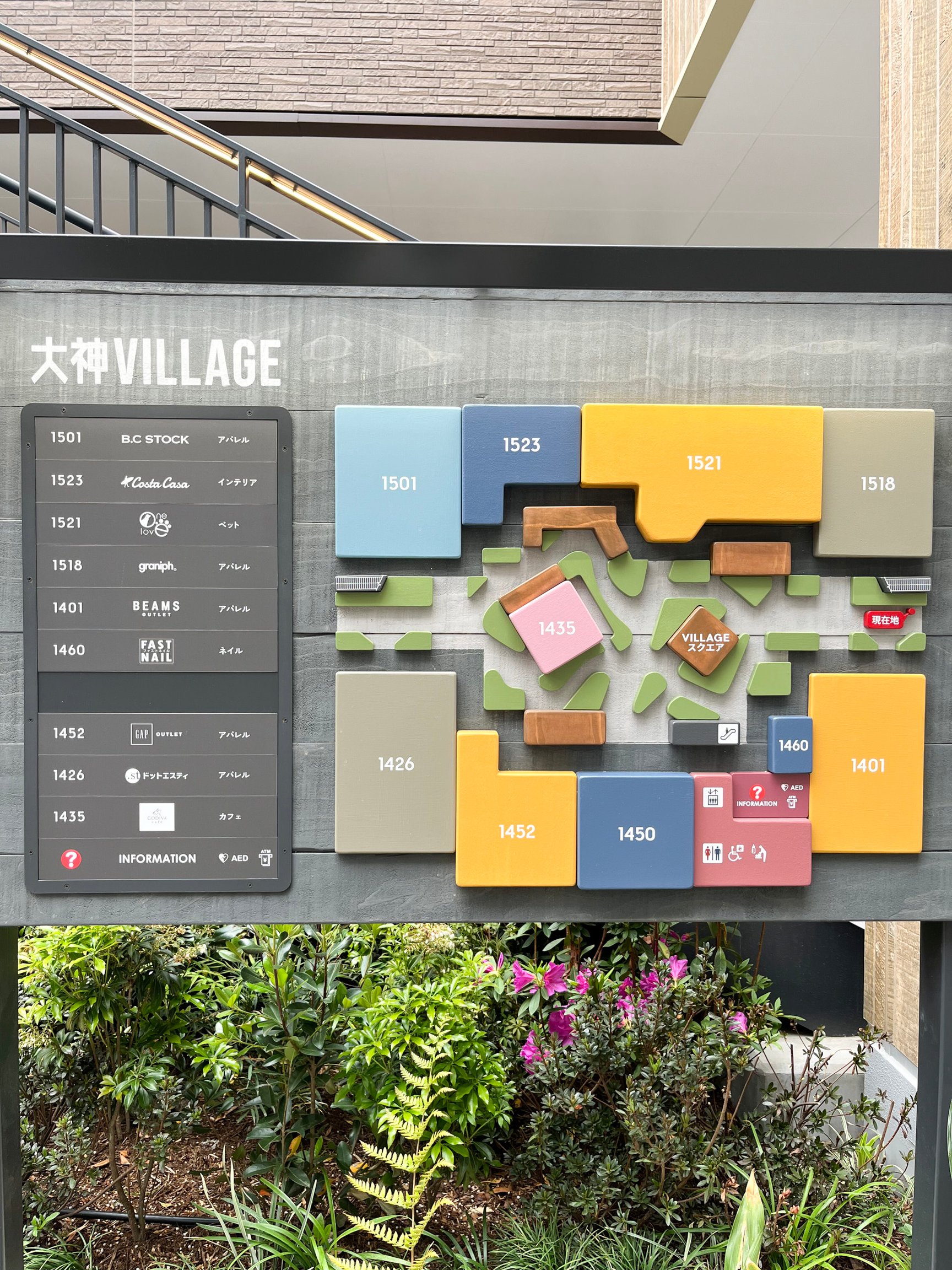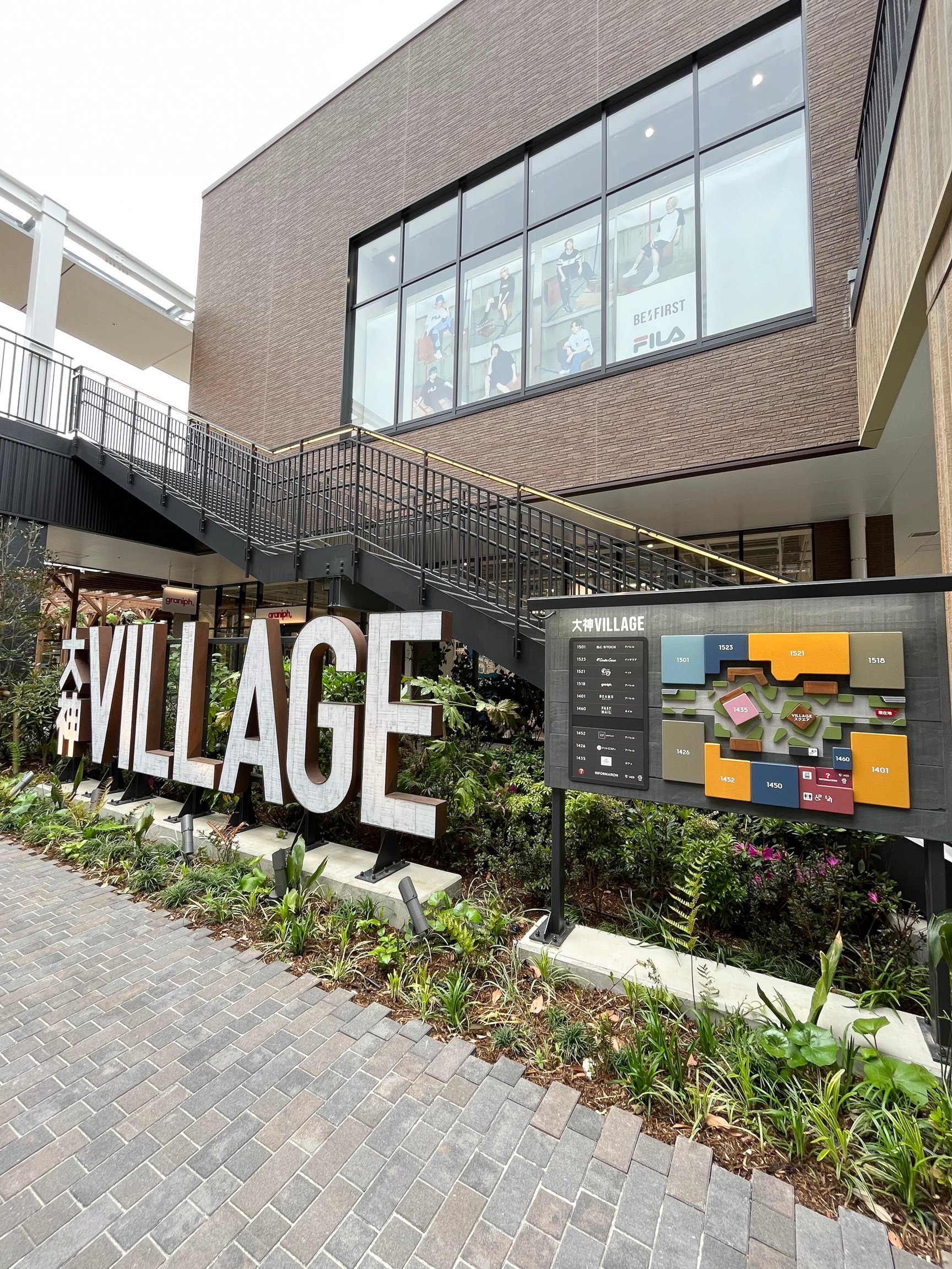 屋根付きのテラス席と豊かな植栽でくつろぎのスペースを提案する「大神ヴィレッジ」を施設の中央に配置。ペットホテルやトリミングショップ、アウトレットモールには珍しいコンビニエンスストアや郵便局など、オープンエアの空間作りに加えて店舗構成やサービスでも地域住民の利便性を意識している。