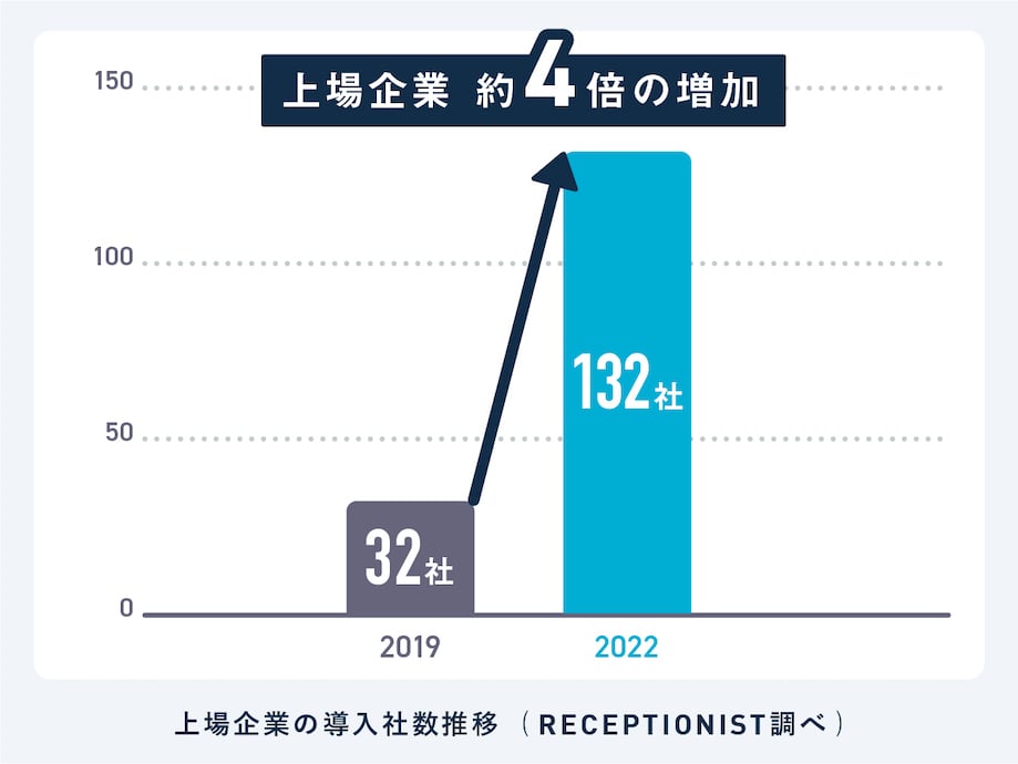 前述の利用回数の増加には、上場企業による受付システムの導入が2019年より4倍の増加となったことが大きく影響しています。もともとはITリテラシーが高く、受付だけに人員を割くことができないスタートアップ・中小企業の導入が中心となっていました。