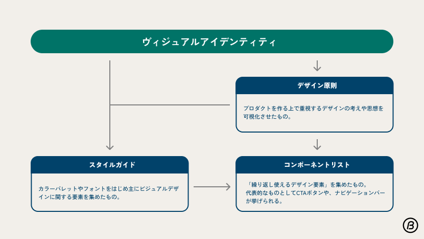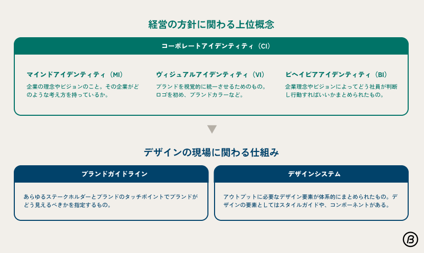 ヴィジュアルアイデンティティをはじめとした企業の方向性を示すアセットは、いわば上位概念に位置し、デザインシステムやブランドガイドラインはより現場に近い概念である。