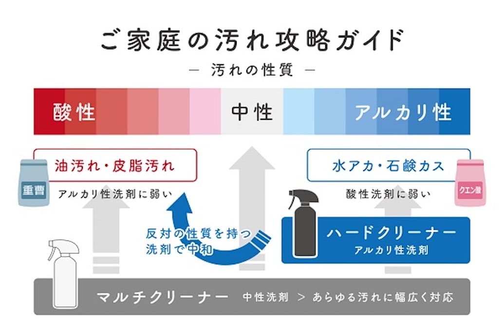 汚れの性質を大別すると、酸性とアルカリ性という2つの種類がある。そして汚れには、「反対の性質を持つ洗剤を使うと効果的に落ちる」という特徴がある。