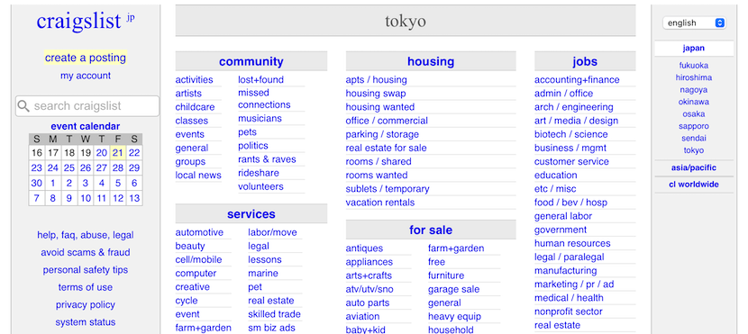 例として、”Craigslist”というサービスがある。1995年に開始された、目的や地域別に誰でも手軽に広告を掲載できるこのWebサイトは、創業からほぼデザインを変更していない。