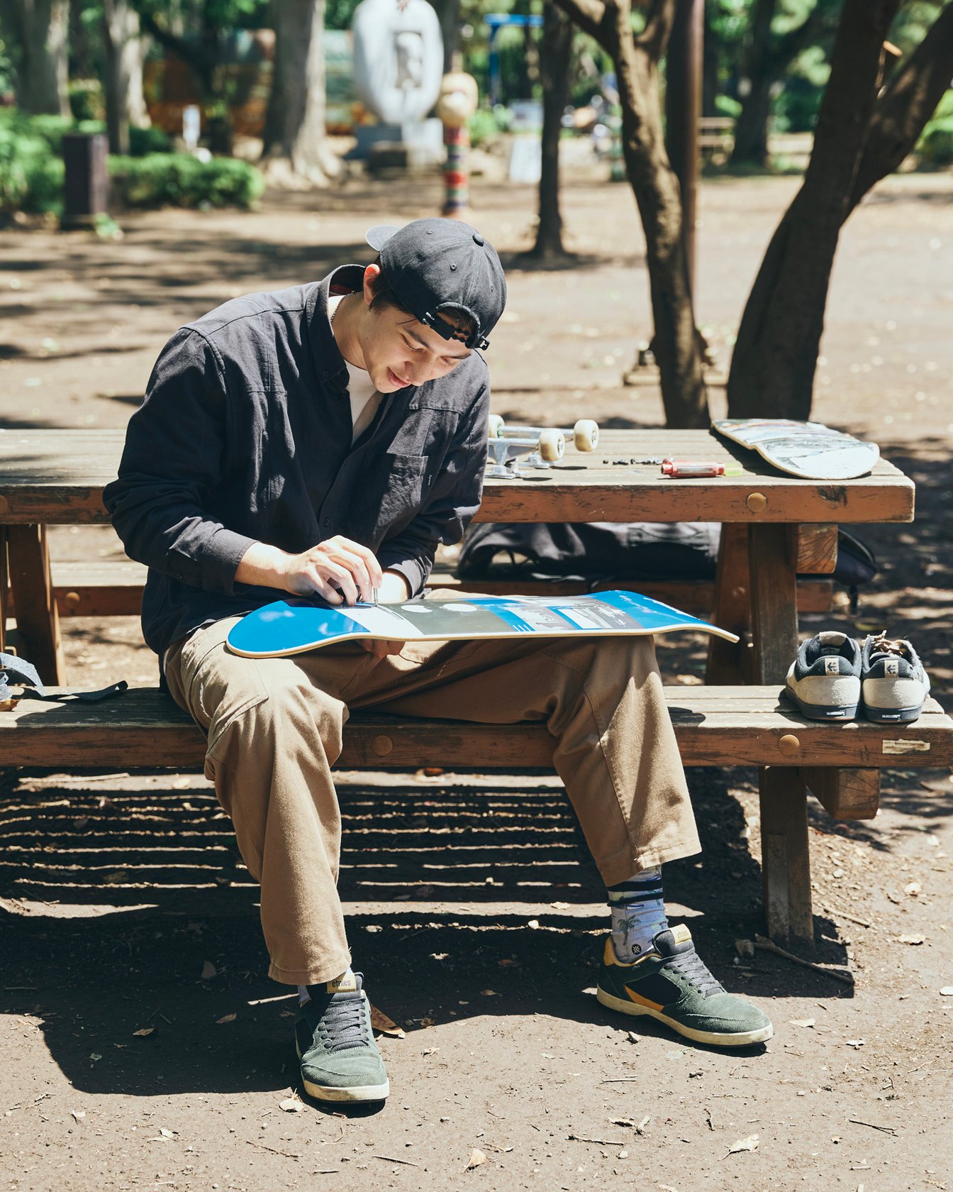ローラーよりも板が傷みやすく、のっかる面はマメに張り替える必要があります。さまざまなデザインがあるので、気分で変えていくことができるのはスケボーの面白さのひとつですね。天気のいい朝は公園でこのセットアップをやります。理由は、単純に気持ちいいから。約10分で終わる作業なので、そのままスケートをすることも多いです。