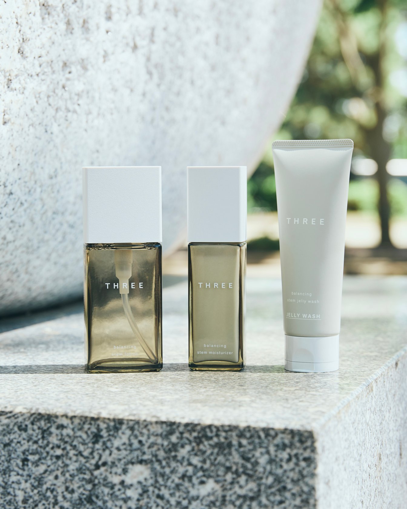 〈左〉バランシングステム モイスチャライザー(自然由来指数96%)80mL ¥7,260 〈中〉同 ローション(自然由来指数92%)120mL ¥5,940 〈右〉同 ジェリー ウォッシュ(自然由来指数91%)100g ¥4,290/すべてTHREE *自然由来指数(ISO16128準拠 水を含む)