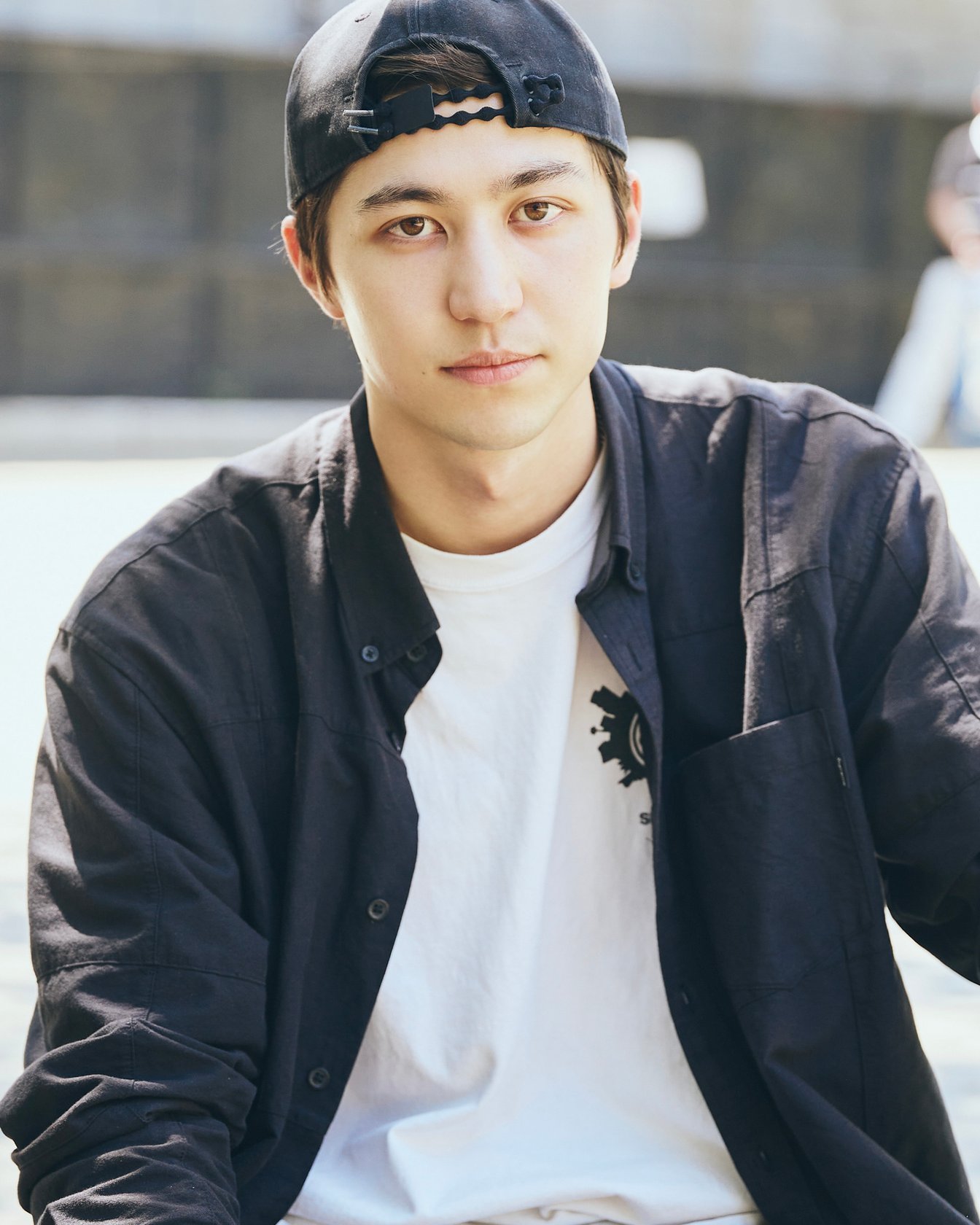 自身のブランド「SHIMON.」のキャップとシャツを着て。ボードは「インペリアル スケートボード」。