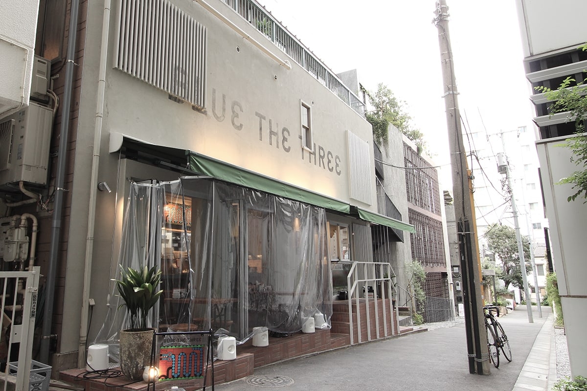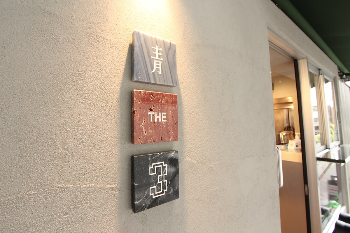 表参道から青山通りを渡り、外苑方面に歩いてすぐ。ポルシェのショールームを過ぎて小道を入った裏手に「ブルー ザ スリー(BLUE THE THREE)」はある。壁面のロゴとドラゴンの看板が印象的な中華エスニックだ。