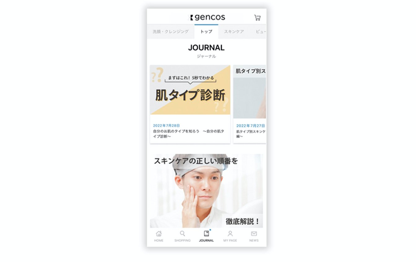 『gencos』のアプリではEC機能を備えながら、メンズ美容の情報も発信している。肌タイプ診断やケア方法、メイク術などユーザーに寄り添う内容だ。「今やスキンケアの情報はSNSでも手に入れやすくなりましたが、情報量が多すぎるのが現状です。『gencos』では正しいスキンケアやメイクのハウトゥーの情報を提供しつつ、そのまま購入できるような、立体的なサービスを目指しています。アプリでは会員登録時の性別や年齢の情報に基づき、ユーザーの世代に最適な記事や商品が表示されるようなシステムを導入しており、今後もユーザー一人ひとりの肌のお悩みを解決できるようなコンテンツや、悩みを解決できる商品を充実させていきたいと思っています」(根本さん)