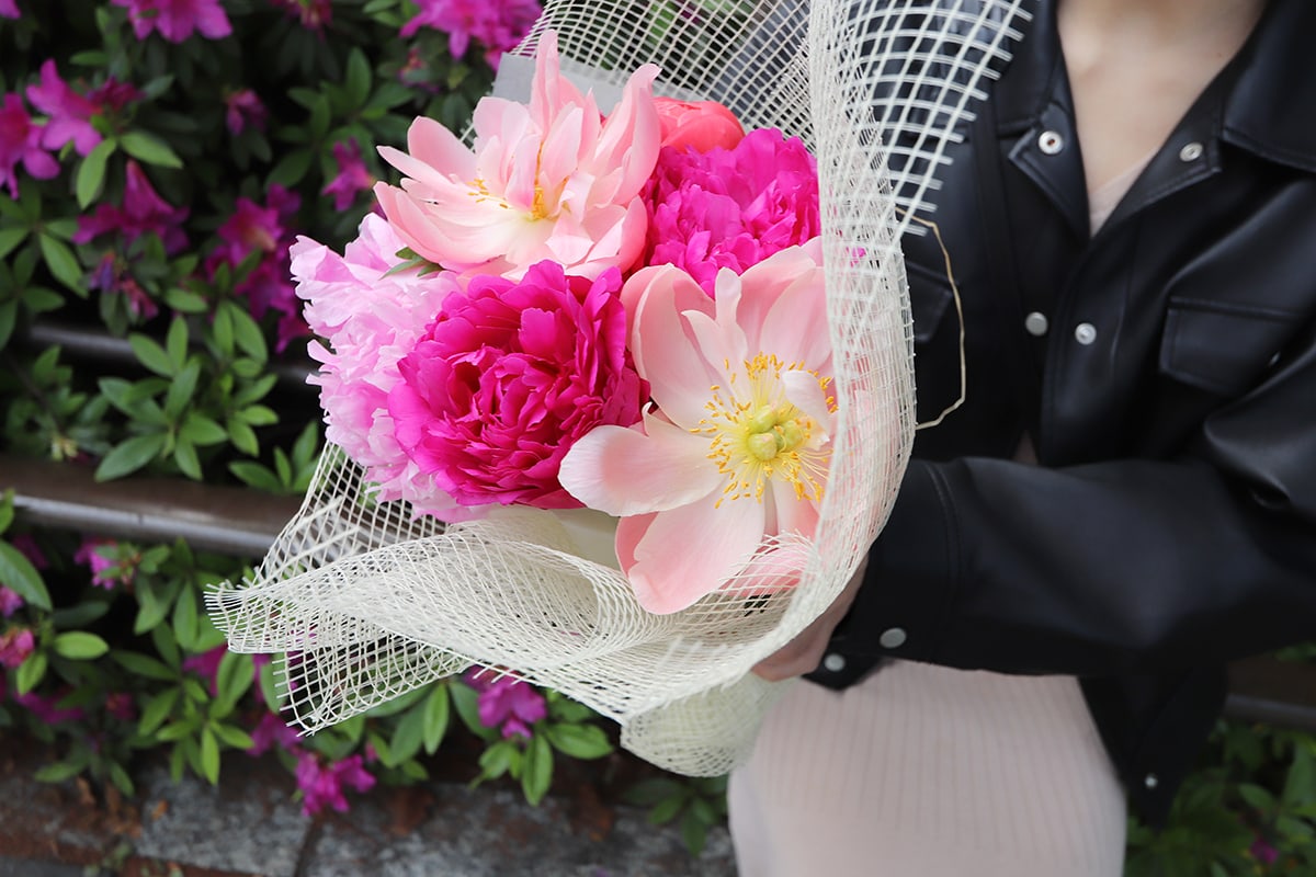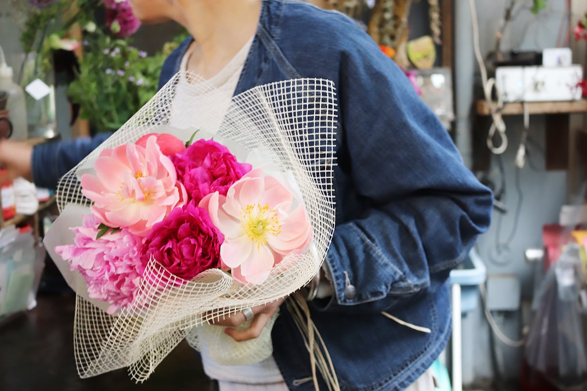 と、まだつぼんでいる芍薬も入れてくれた。初夏の日差しに大輪の花が美しく映える、芍薬のブーケが出来上がった。