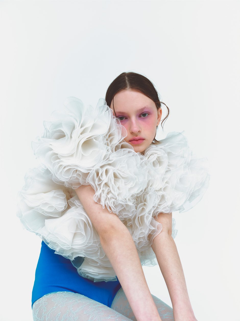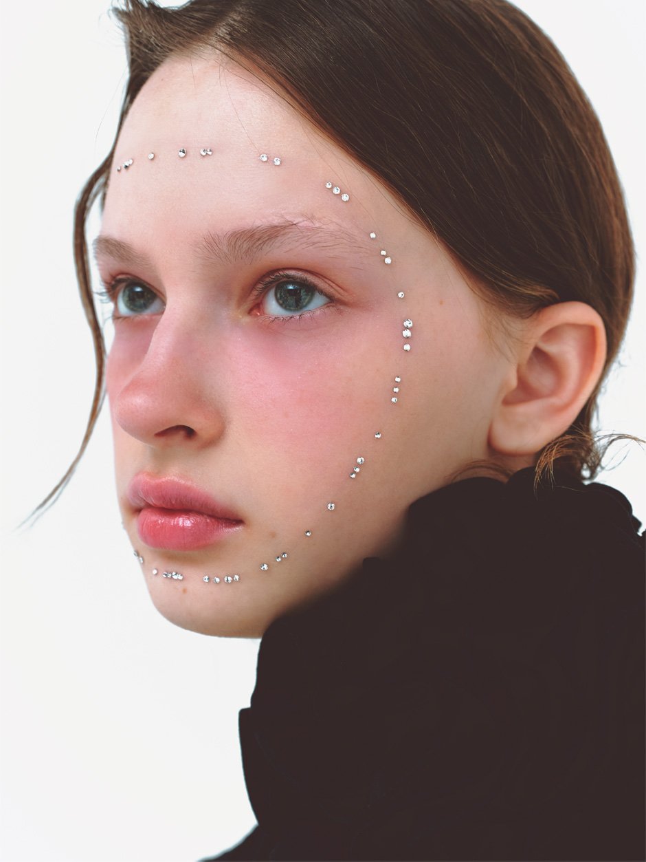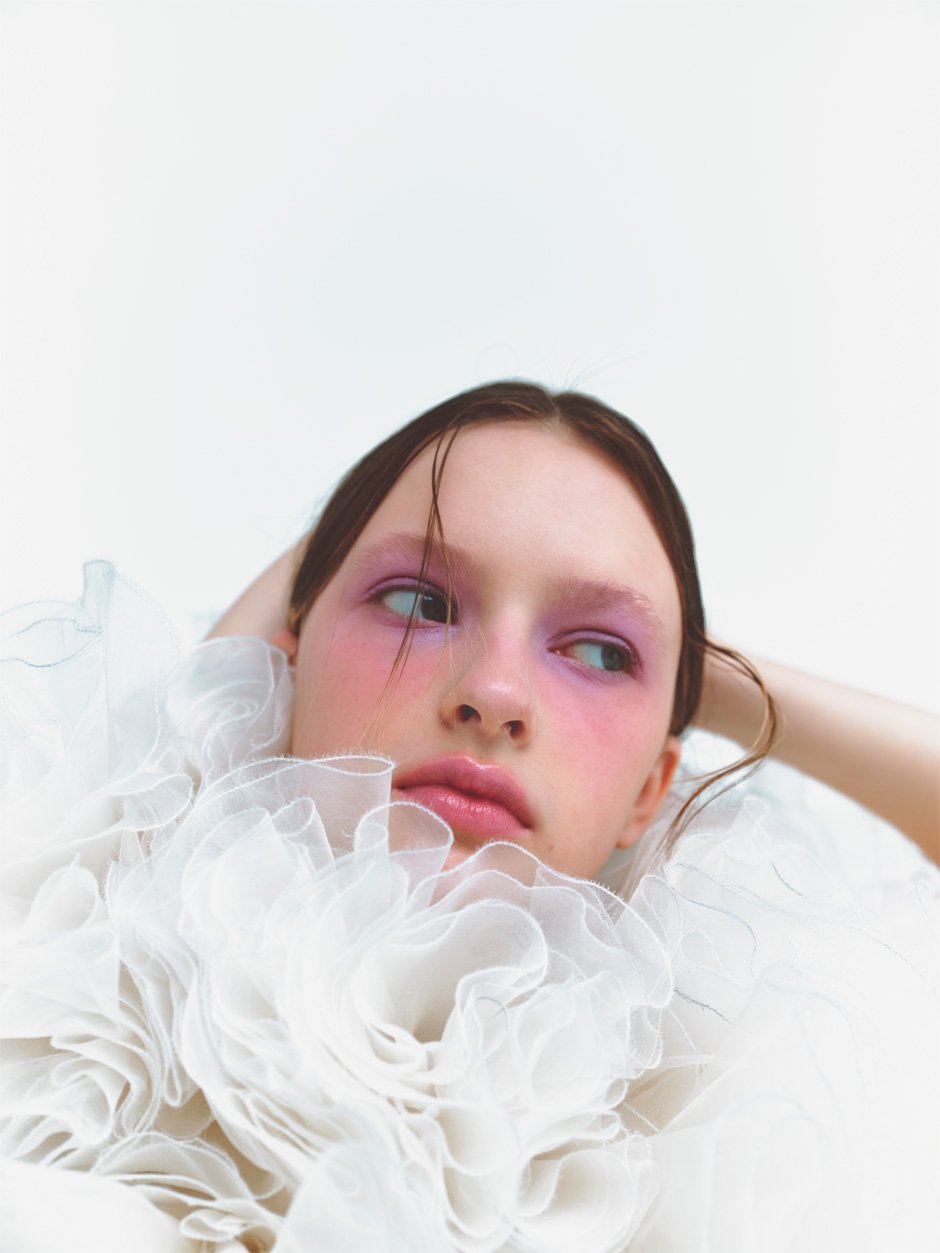 top ¥495,000 by SAPHIR EAST LYUMME, shorts ¥22,000 by NINA RICCI IZA, shoes ¥33,000 by PIPPICHIC, tights stylist's own, Real Flawless Weightless Perfecting Foundation 0C1 ¥6,820, Real Flawless Luminous Perfecting Pressed Powder ¥6,490, Caviar Stick Eye Color 06 ¥3,520, Blush Color Infusion 03 ¥4,180 and Tinted Moisturizer Blush PK1 ¥3,740 by LAURA MERCIER LAURA MERCIER JAPAN