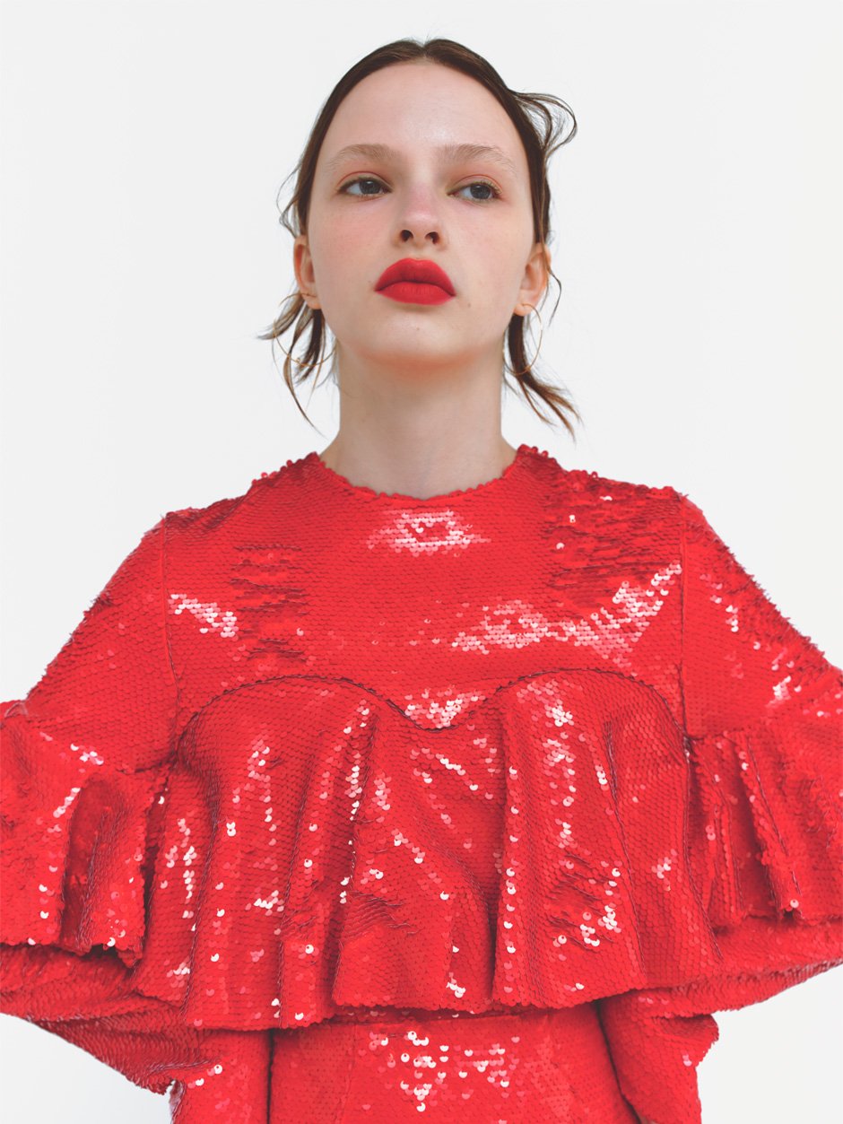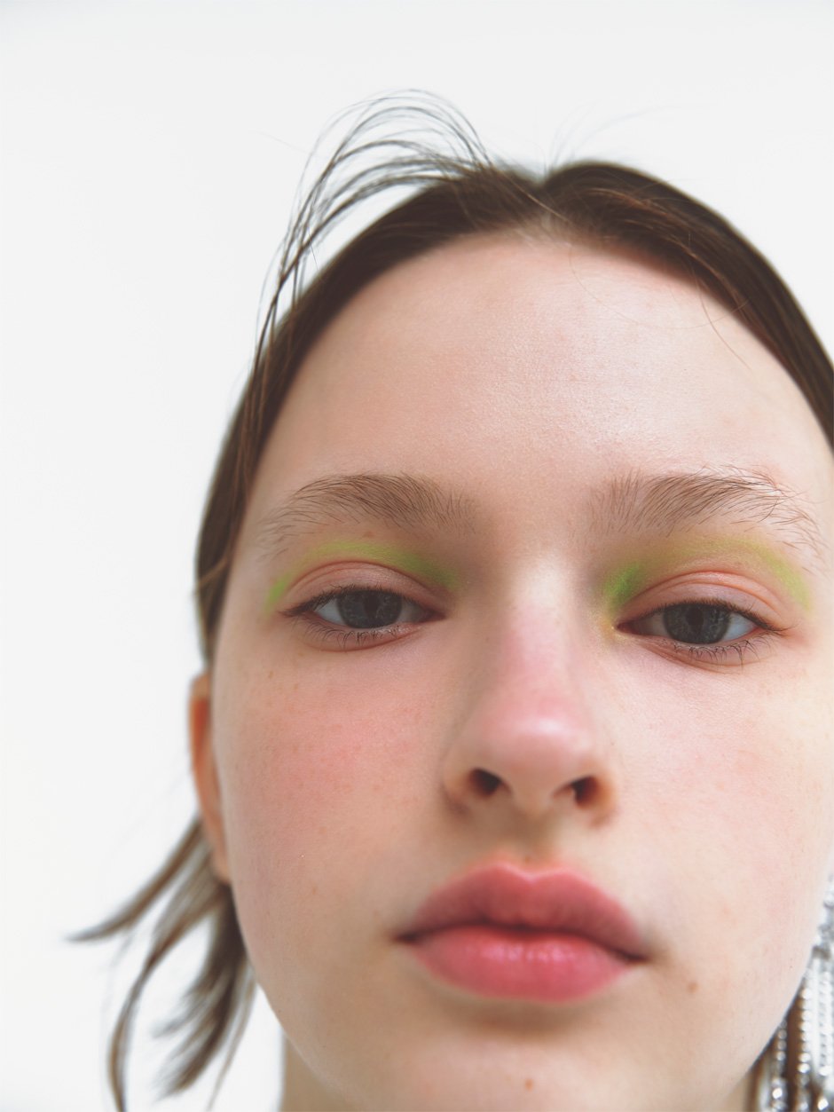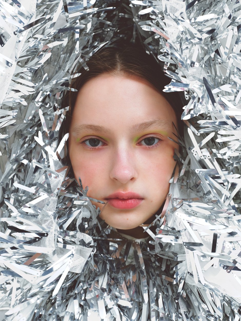 top ¥495,000 by SAPHIR EAST LYUMME, shorts ¥22,000 by NINA RICCI IZA, shoes ¥33,000 by PIPPICHIC, tights stylist's own, Real Flawless Weightless Perfecting Foundation 0C1 ¥6,820, Real Flawless Luminous Perfecting Pressed Powder ¥6,490, Caviar Stick Eye Color 06 ¥3,520, Blush Color Infusion 03 ¥4,180 and Tinted Moisturizer Blush PK1 ¥3,740 by LAURA MERCIER LAURA MERCIER JAPAN