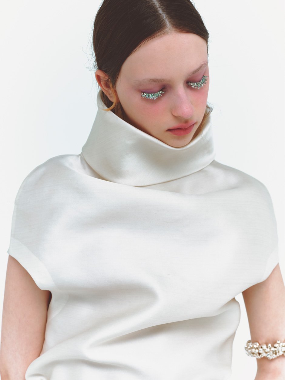 top ¥129,800 by GIA STUDIOS THE WALL SHOWROOM, bracelet ¥55,000 by PATOU IZA, Real Flawless Weightless Perfecting Foundation 0C1 ¥6,820, Blush Color Infusion 06 ¥4,180 and Petal Soft Lipstick Crayon 362 ¥3,850 by LAURA MERCIER LAURA MERCIER JAPAN