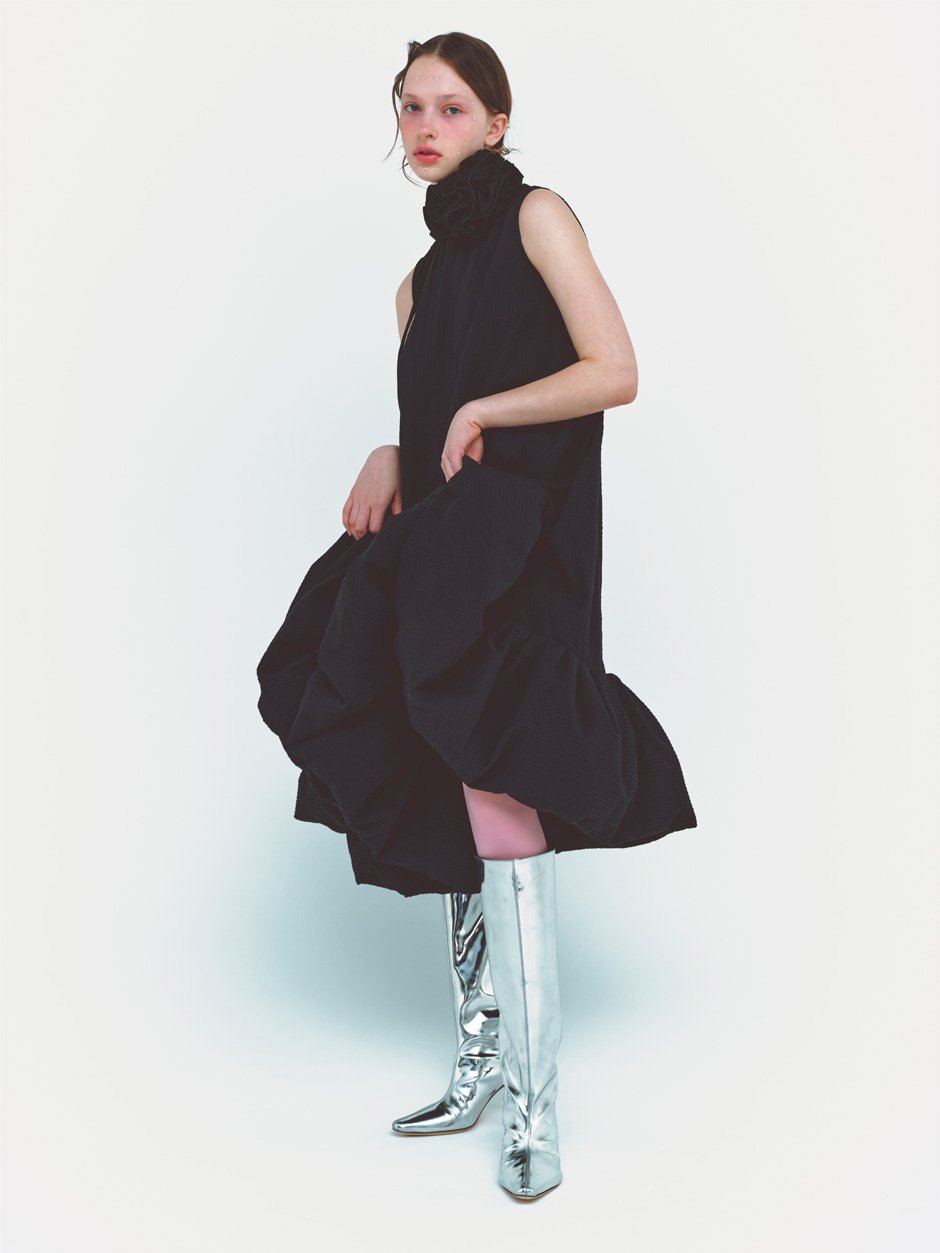 dress ¥256,300 by MELITTA BAUMEISTER DOVER STREET MARKET GINZA, boots ¥101,200 by BY FAR H3O FASHION BUREAU, choker (with swimwear) ¥93,500 by LUDLOW LUDLOW ONLINE STORE, tights stylist's own, Real Flawless Weightless Perfecting Foundation 0C1 ¥6,820, Blush Color Infusion 07 ¥4,180, Tinted Moisturizer Blush PK1 ¥3,740 and Petal Soft Lipstick Crayon 323 ¥3,850 by LAURA MERCIER LAURA MERCIER JAPAN