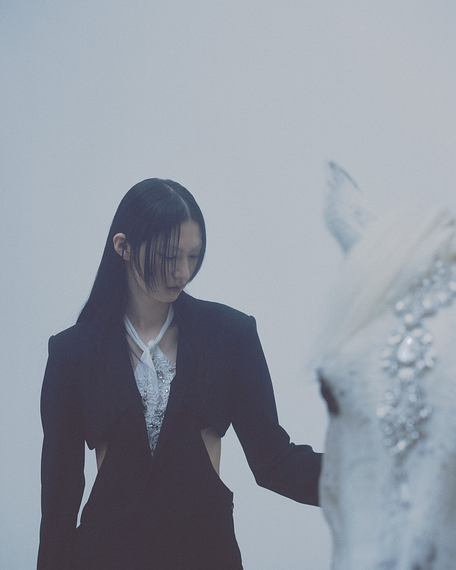 23年秋冬のテーマは「ビハインドザムーン」。チュールにビジュー装飾をちりばめたマントに、ネッカチーフをヘアアクセサリーにしてスタイリング