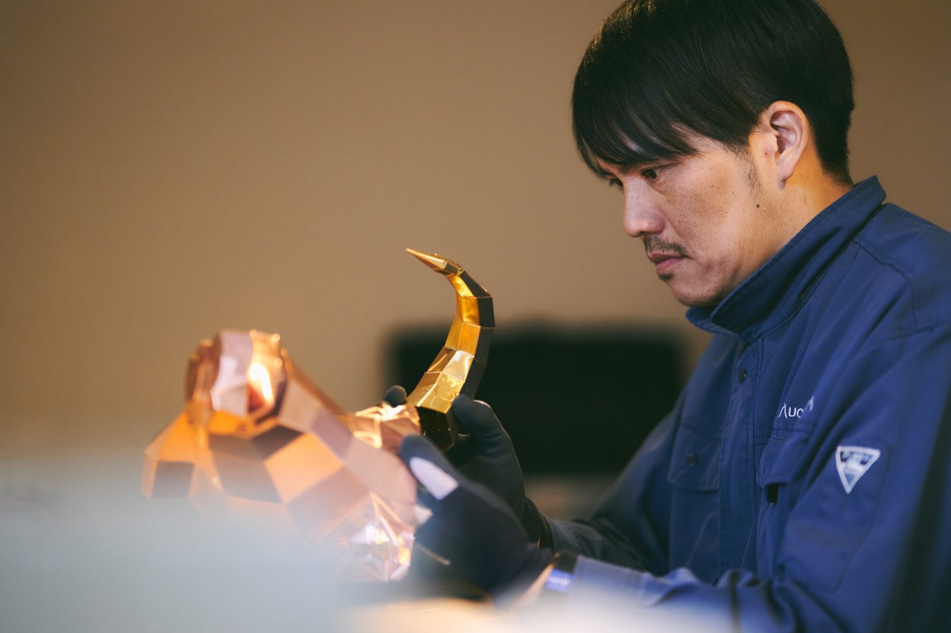 たまたま隈さんが、別の板金屋仲間から「おもしろい板金屋がいるよ」と折鶴をプレゼントでもらい、わたしたちのことを認知していました。デスクの前に置いて眺めていたほど、技術に感動してくれたようです。5分間のプレゼンで牛のオブジェも写真で見せたりしていると、「すごいね、君」と言ってくださり、その勢いでプロジェクトがはじまりました。