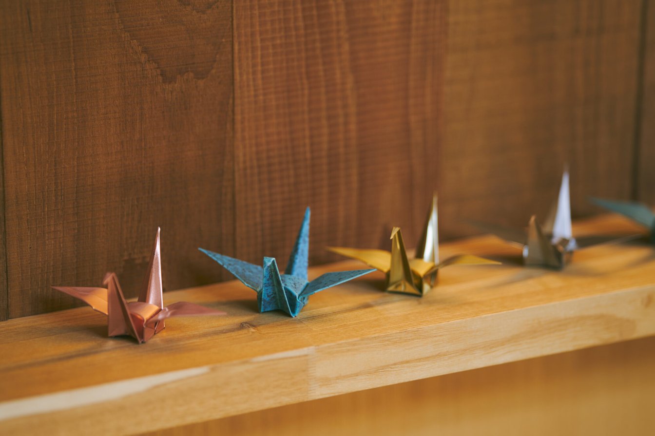 以前、オーストラリアの方から「自分が建てた新築を販売するときに、階段の吹き抜けに折鶴をシャンデリアのように飾りたい」と、100羽のオーダーがありました。下からライトアップすると、光の反射でキラキラして、ゲストが喜んでくれるみたいです。